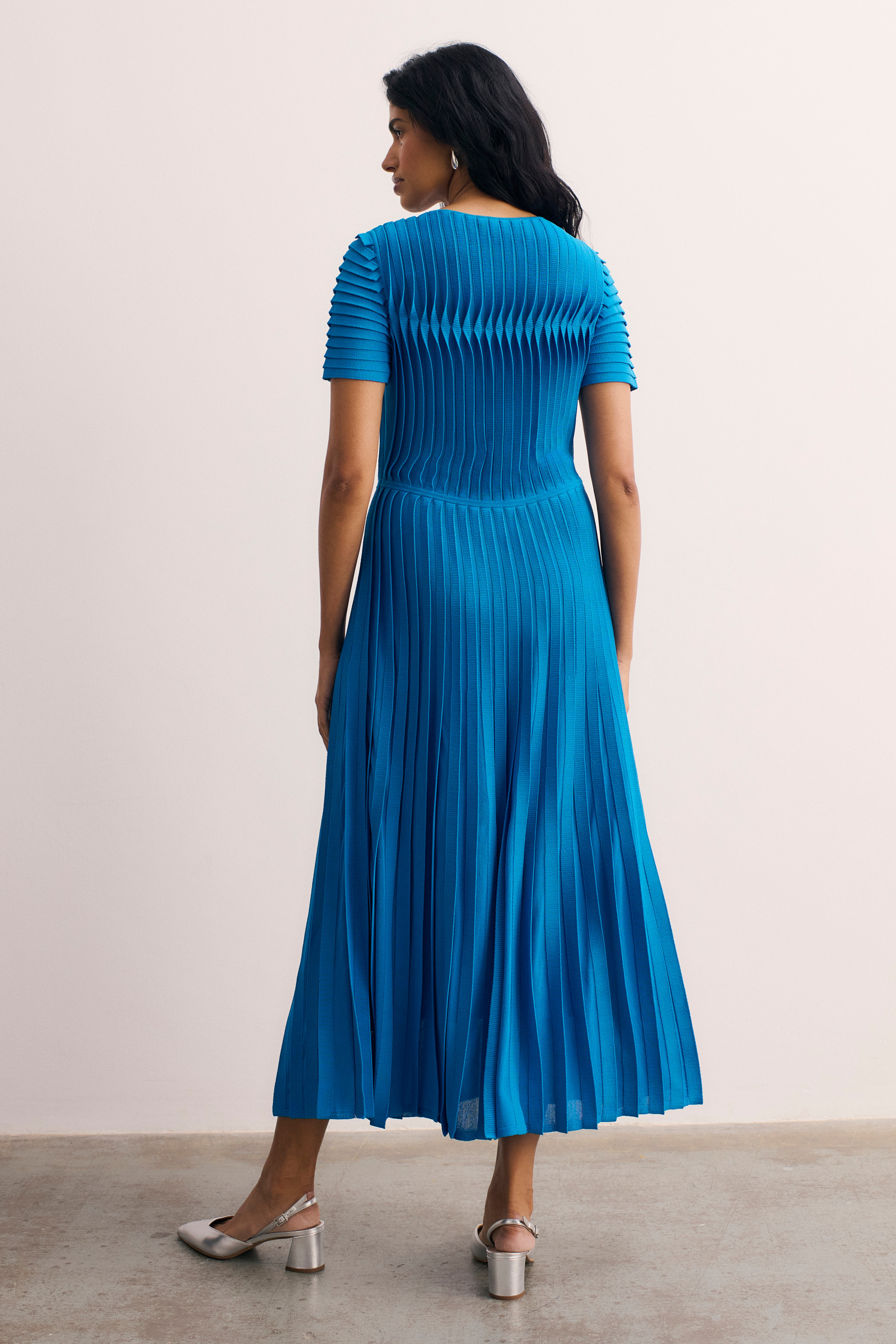 Our bestselling Allegra dress is back. It’s detailed with carefully engineered three-dimensional pleats which extend into sunray panels through its skirt, lending an architectural feel to the otherwise fluid shape. Plus, it’s crafted from machine-washable stretch knit.