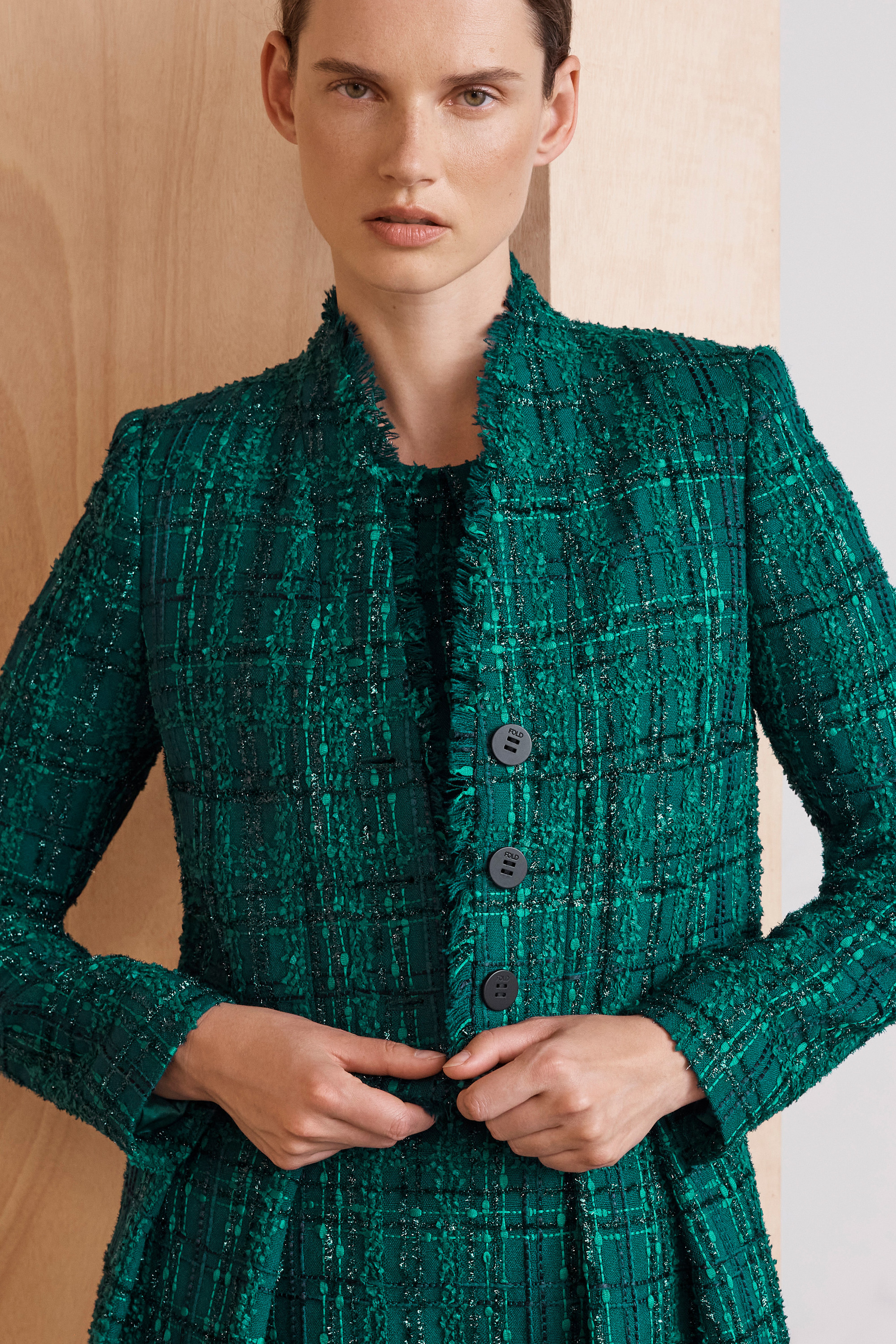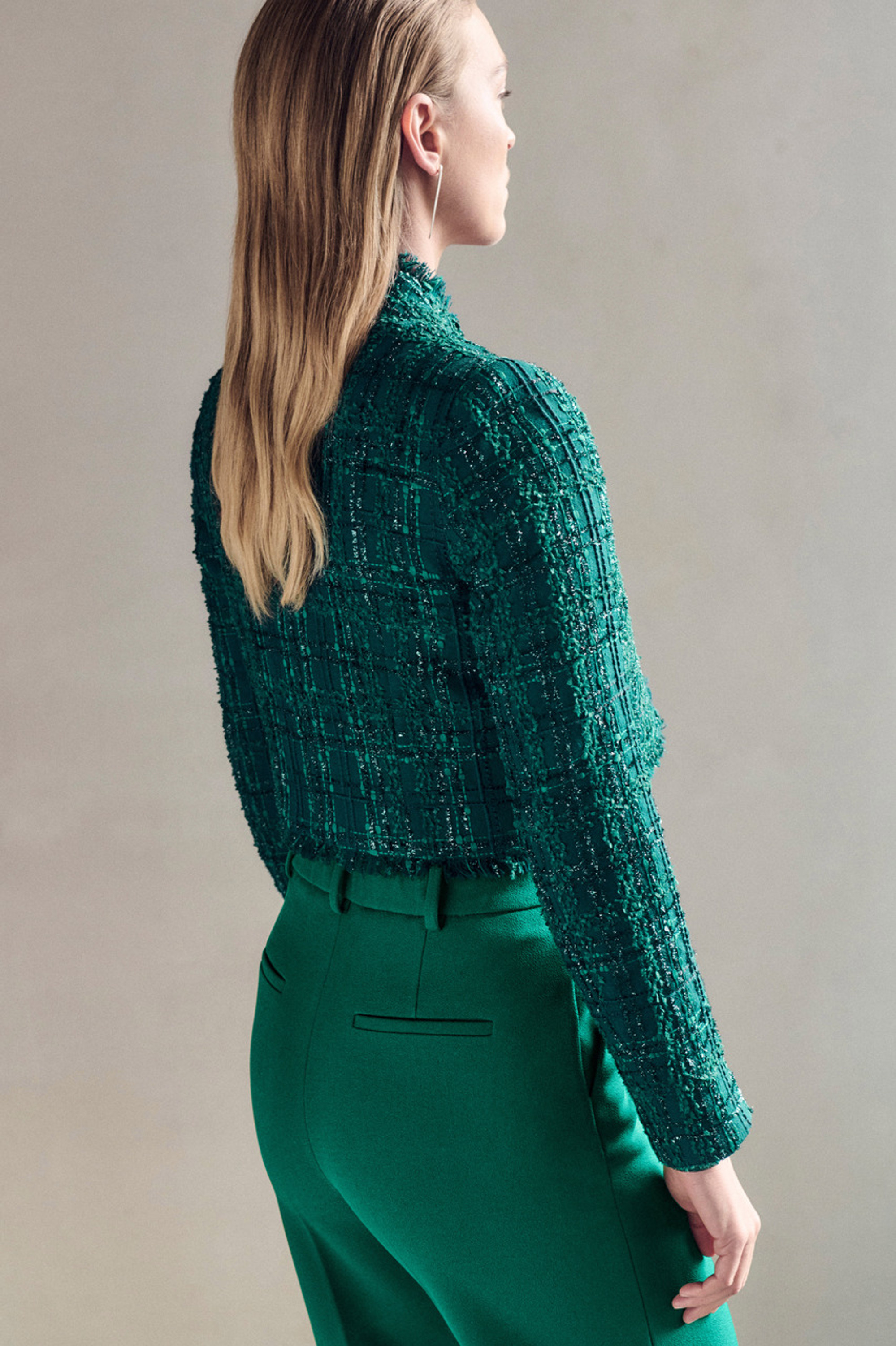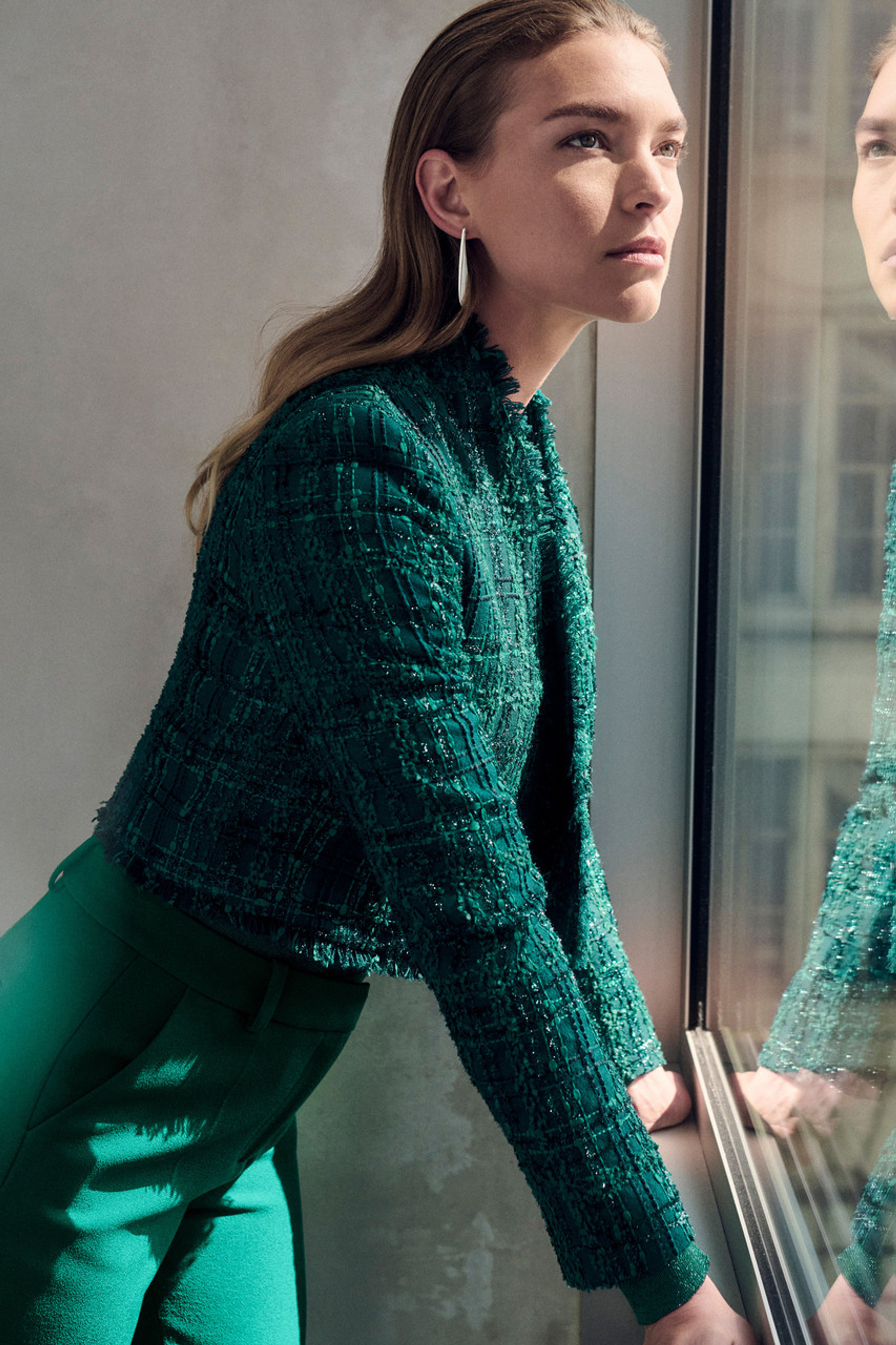 Crafted from luxurious tweed woven in Linton’s prestigious English mill, the Alton jacket is a true couture piece – without the price tag. Its cropped, boxy silhouette is perfect for the office, while the metallic threads that run throughout ensure a truly special feel. Wear yours with black or forest green tailored trousers.