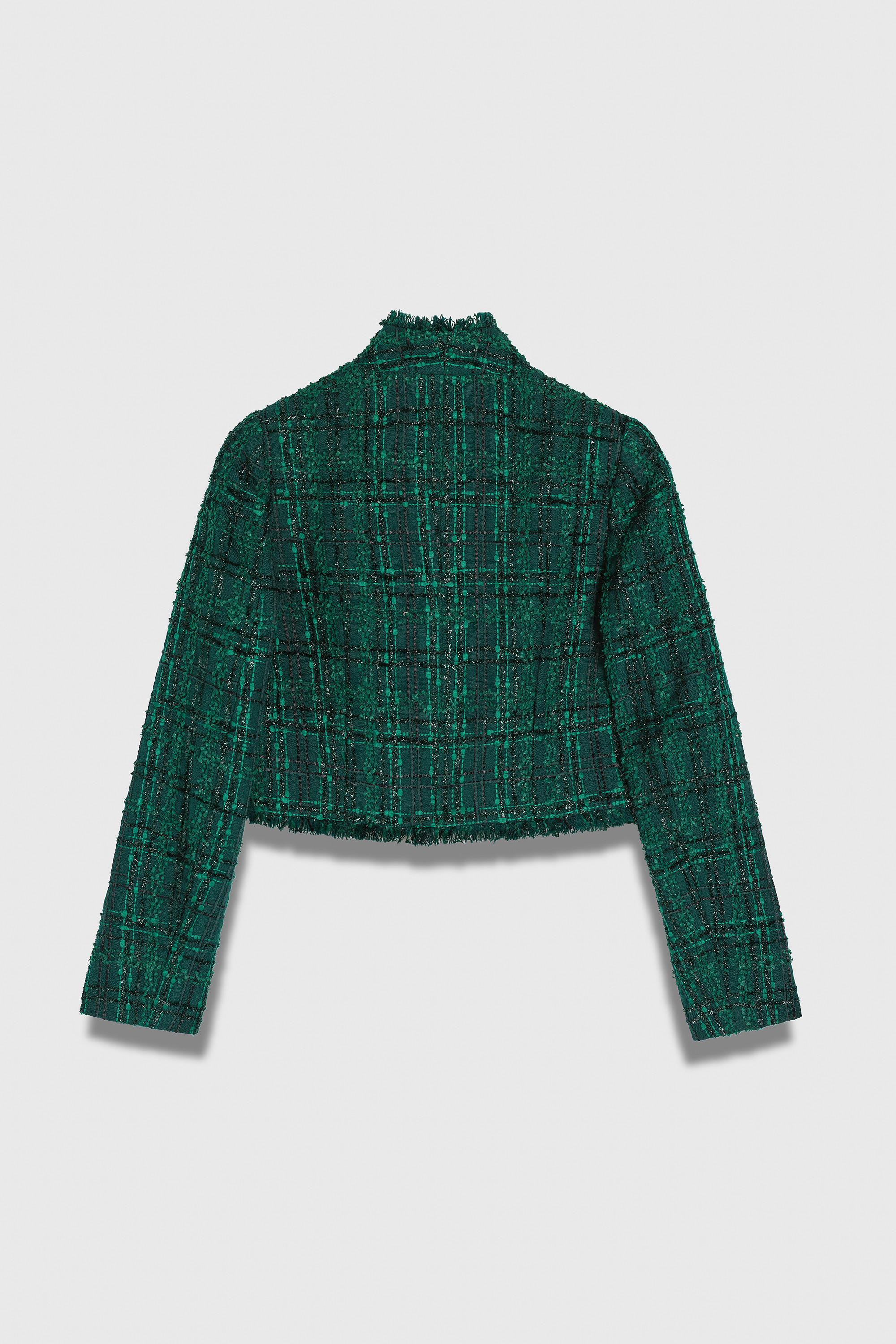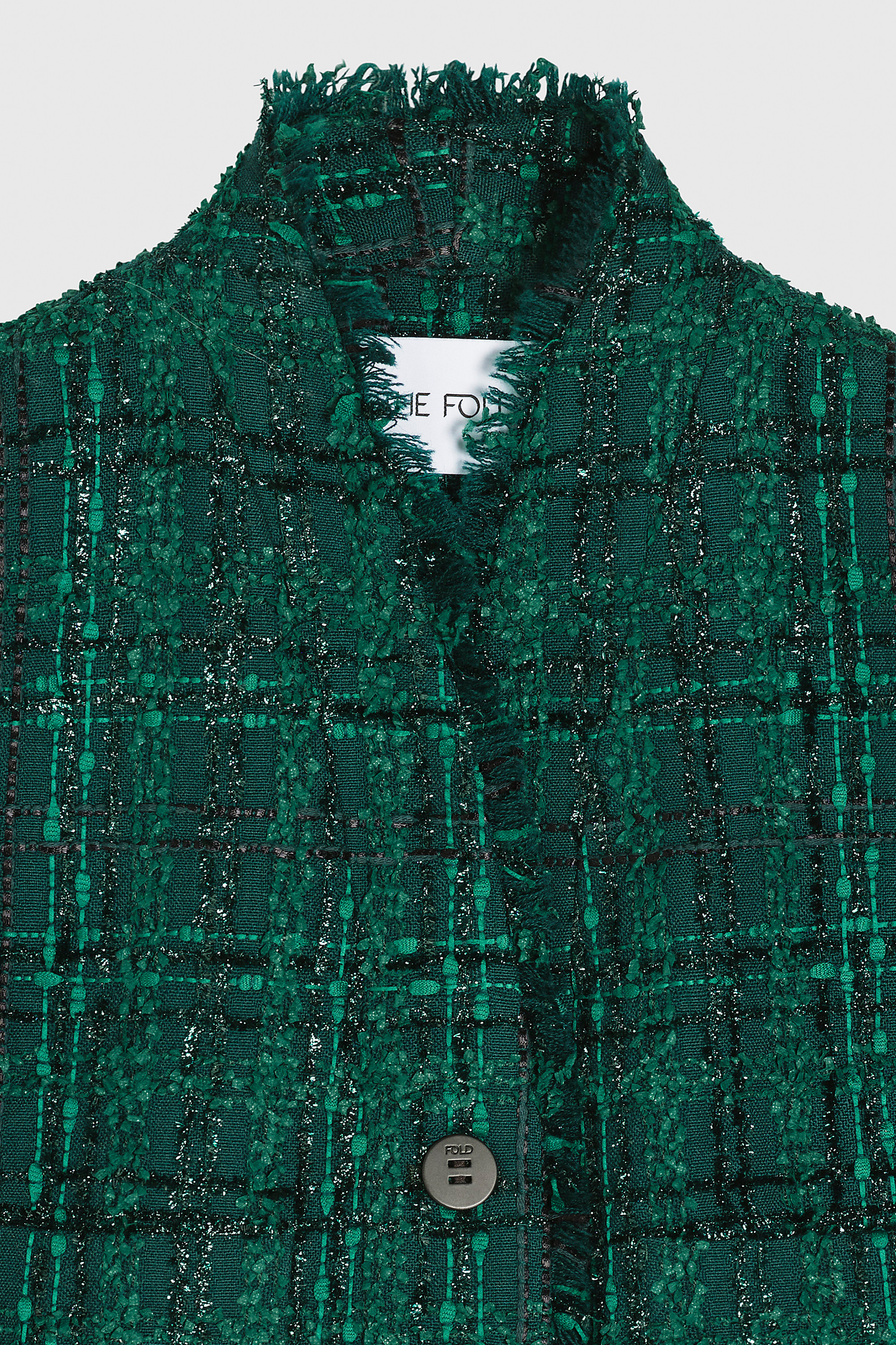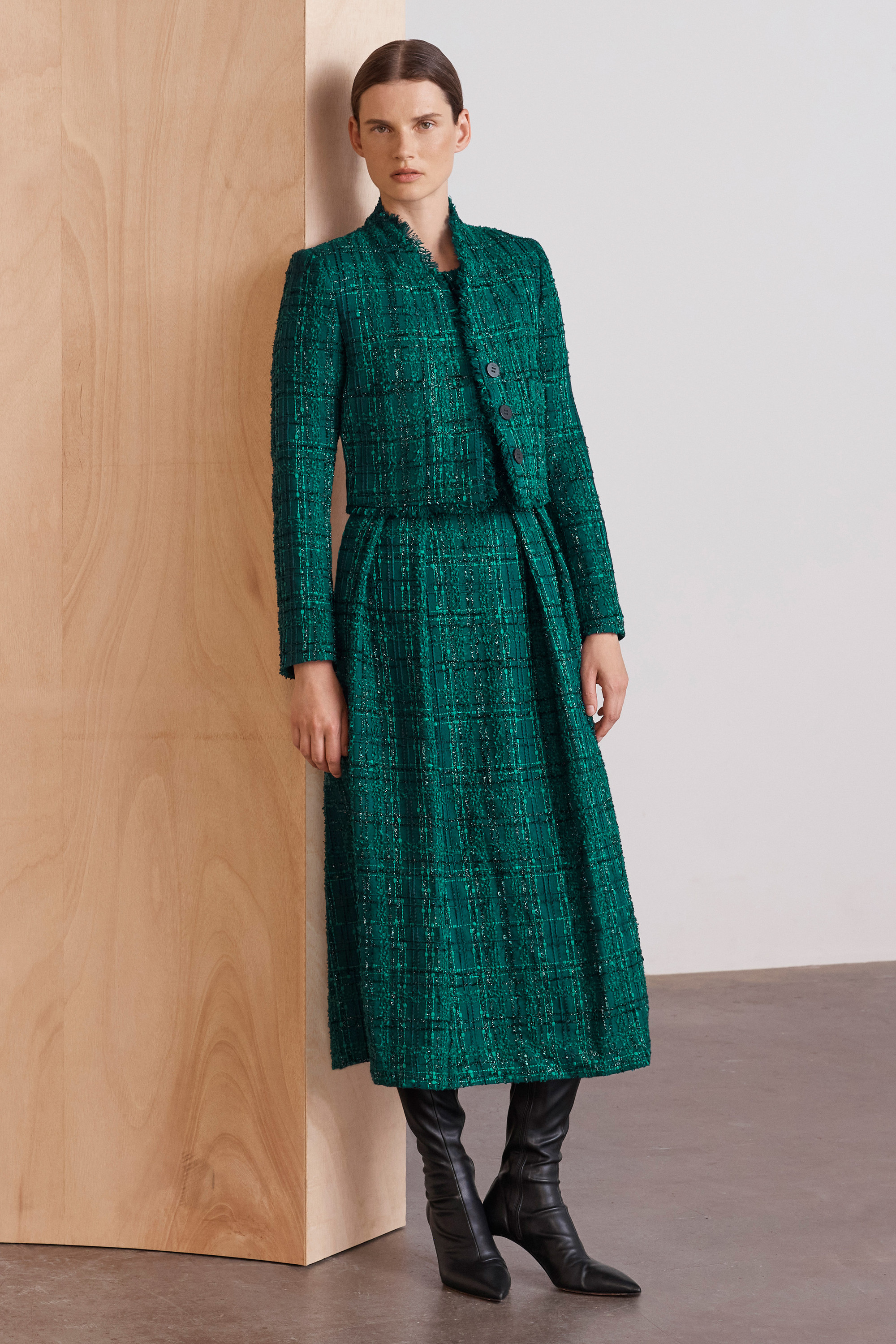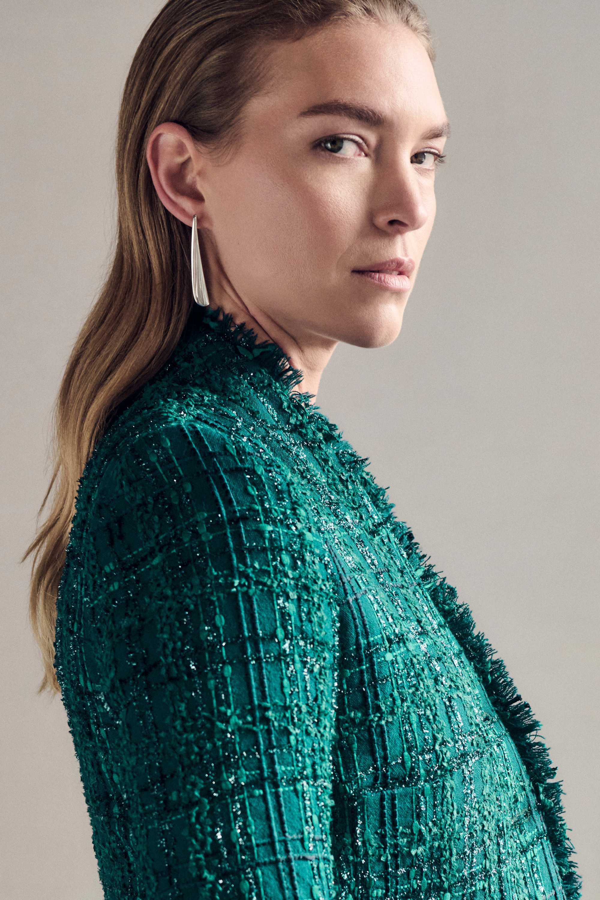 Crafted from luxurious tweed woven in Linton’s prestigious English mill, the Alton jacket is a true couture piece – without the price tag. Its cropped, boxy silhouette is perfect for the office, while the metallic threads that run throughout ensure a truly special feel. Wear yours with black or forest green tailored trousers.