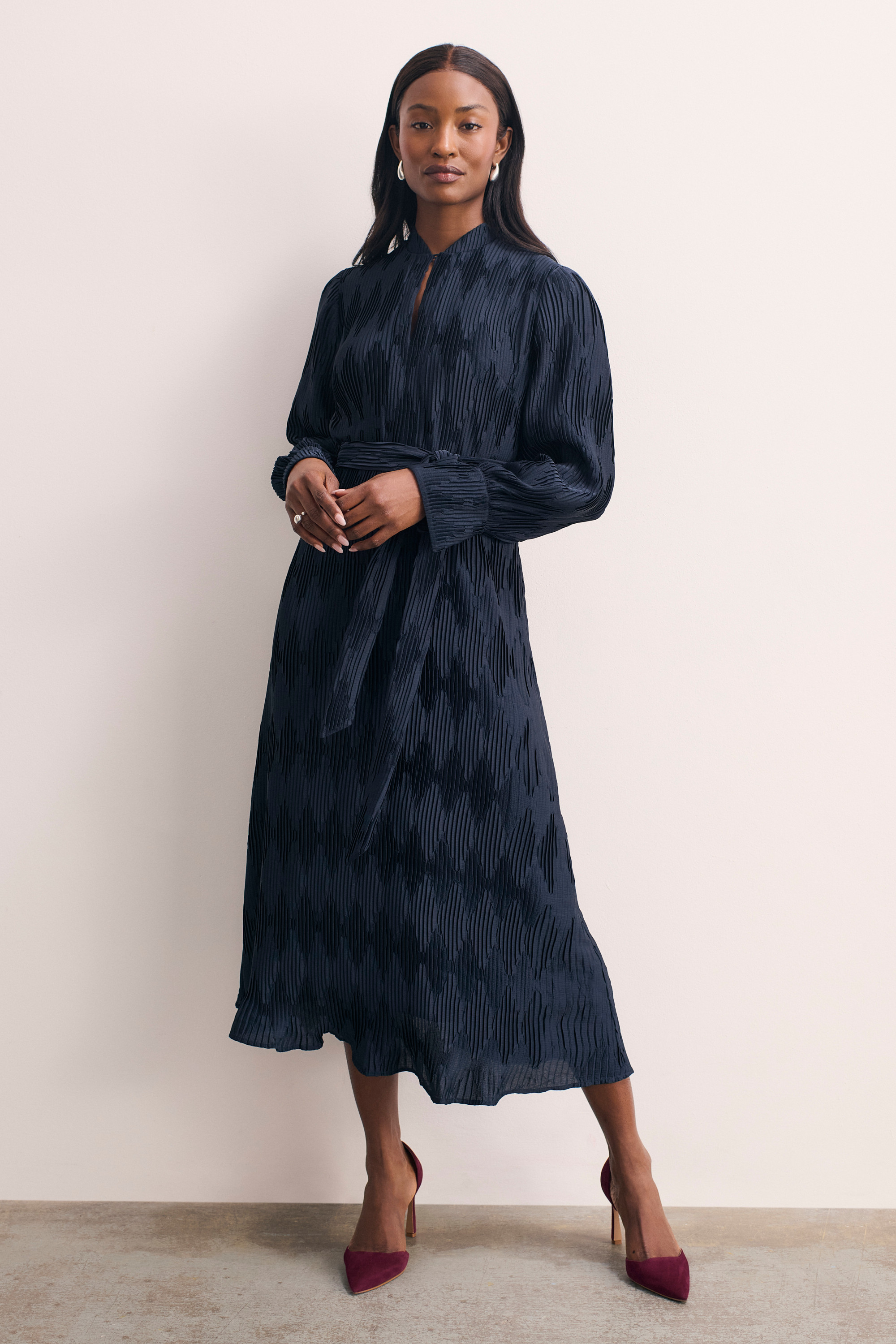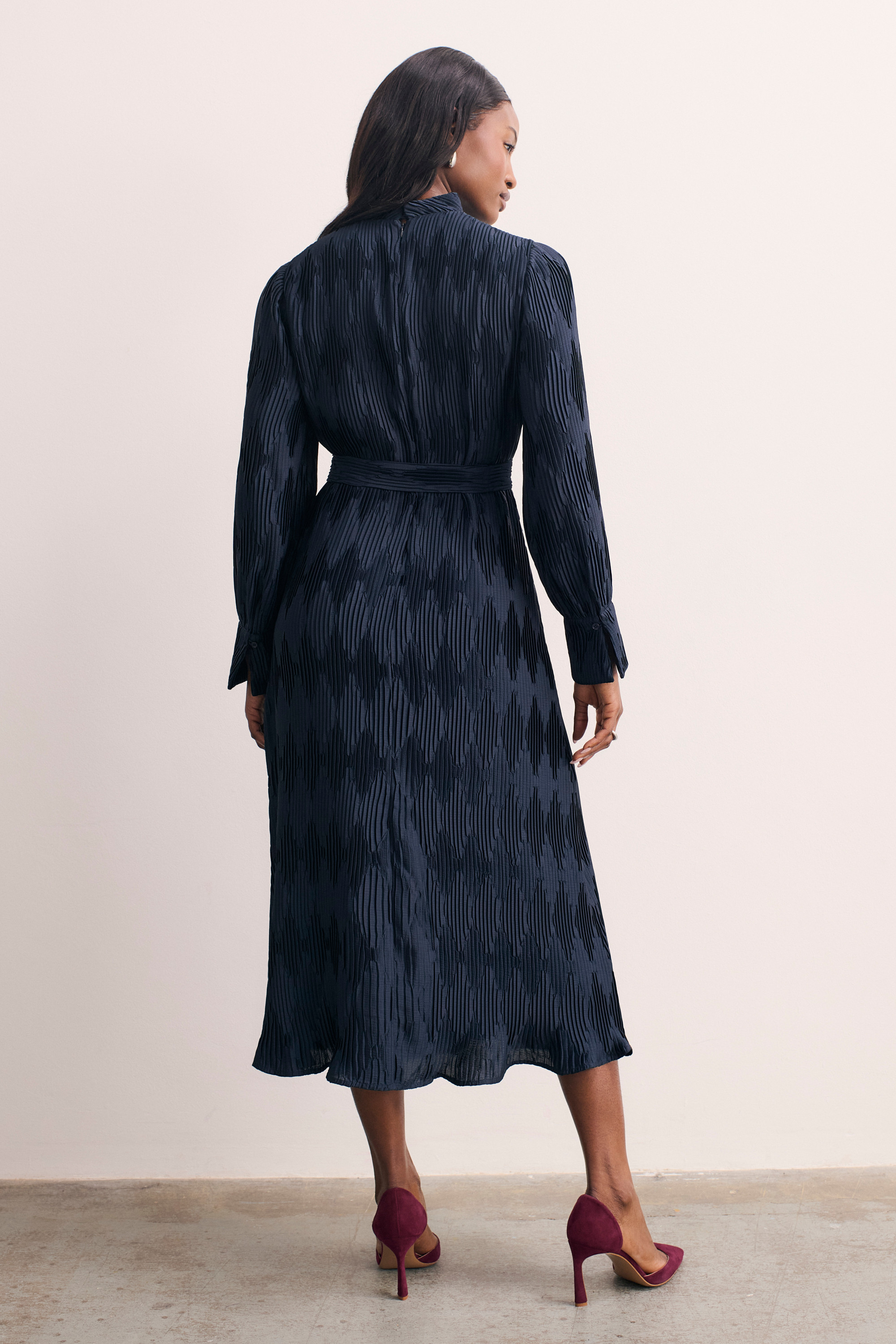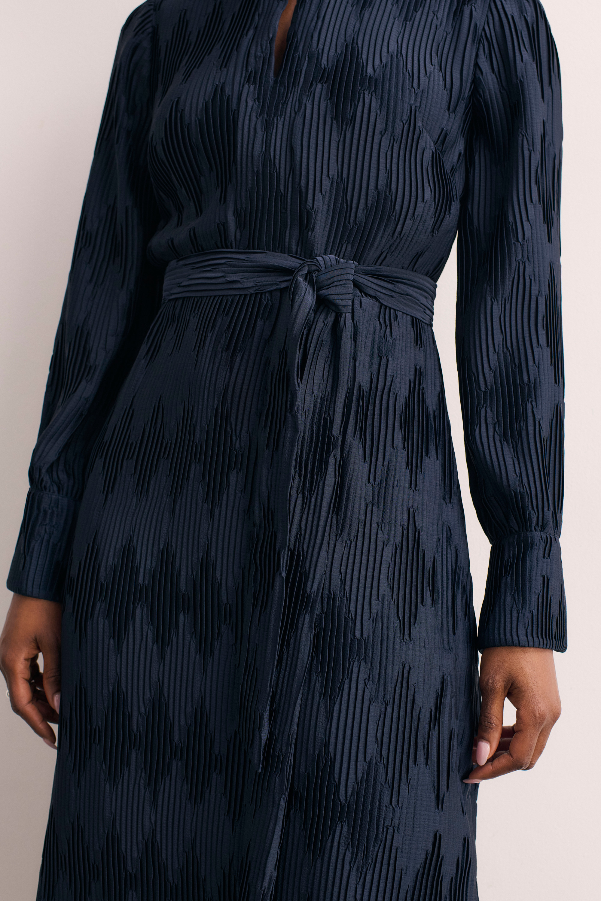 Looking for a dress that you can wear to work and on the weekends? Aurellie is just that. The diamond detailing has been achieved by alternating the direction of our favourite pleats for a subtle yet tactile look, while the relaxed silhouette and waist tie ensure a relaxed finish.