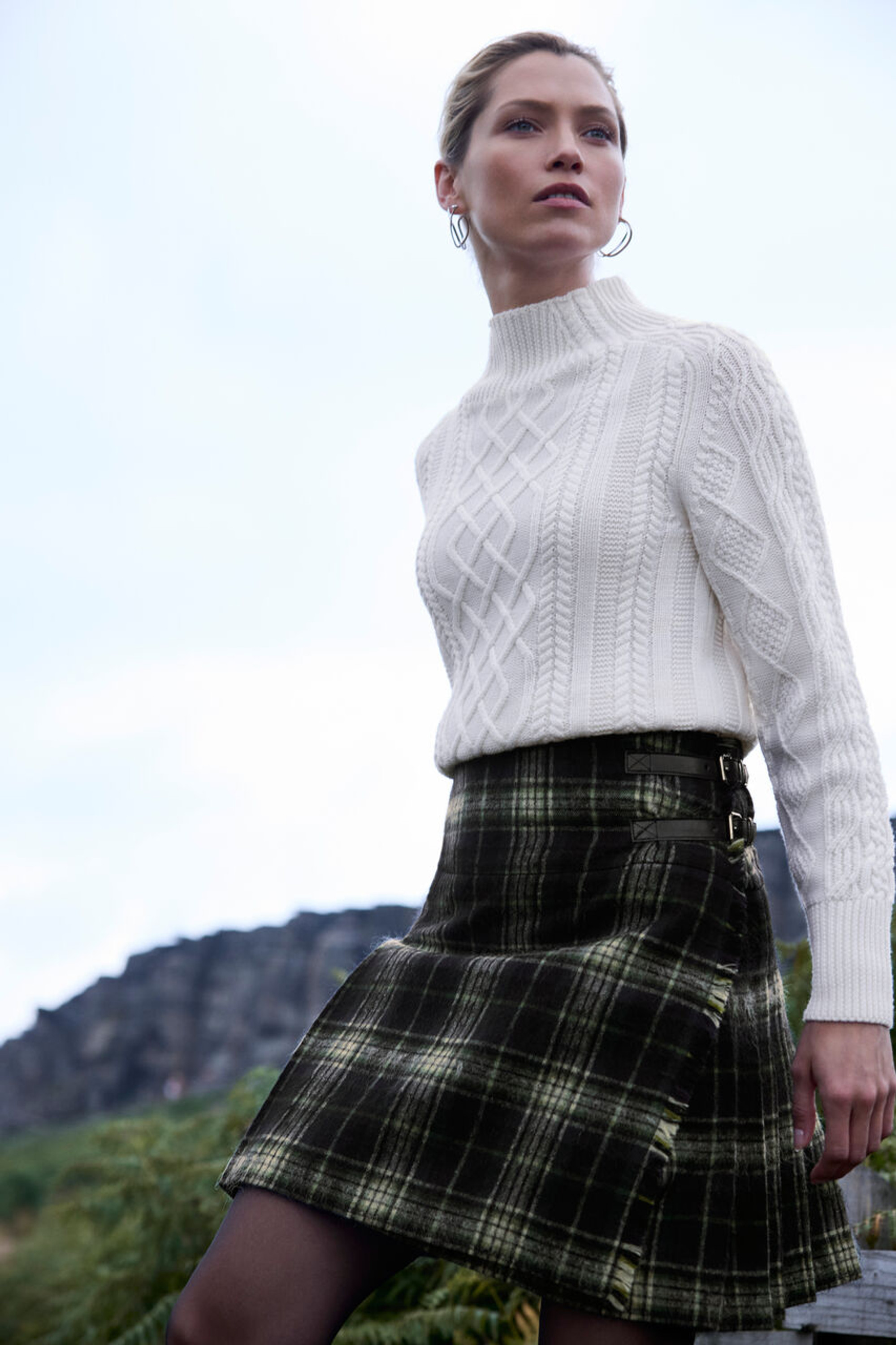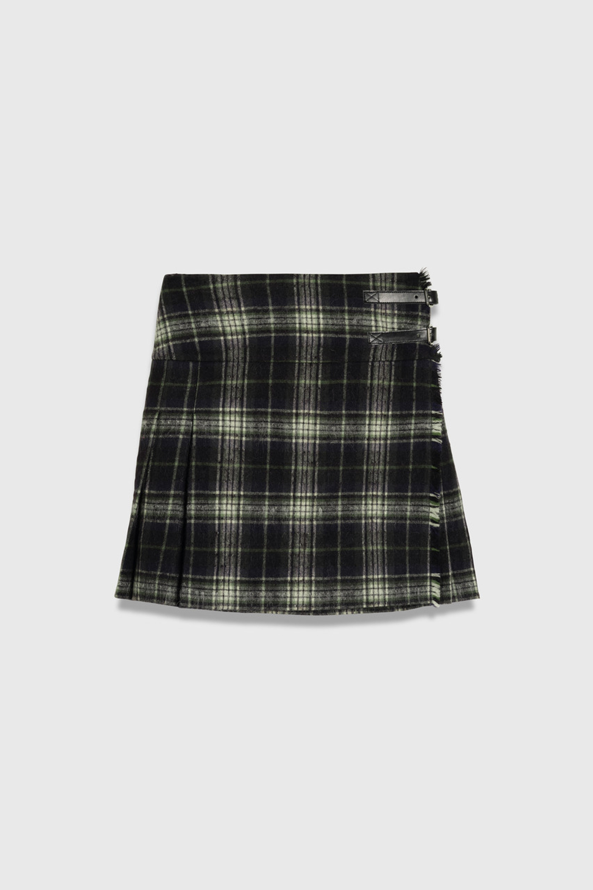 In keeping with tradition, the Balintore skirt features sharp knife pleats with a flat, wrapped front that fastens with leather kilt straps. Its mini silhouette makes it the perfect choice for styling with tights and knee-high boots, and its brushed mohair composition and frayed edge create a tactile finish.