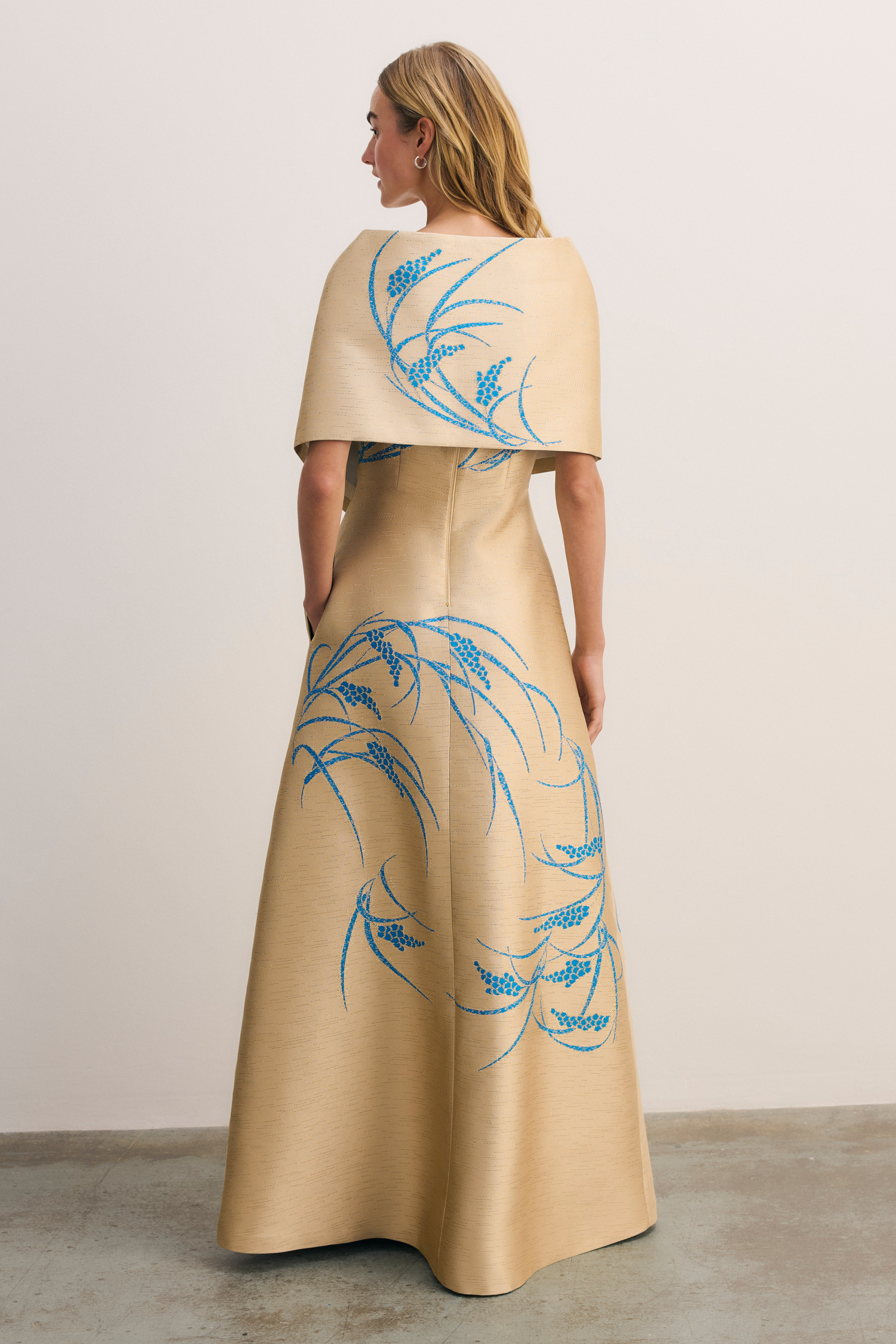 The jacquard Bari wrap is designed to be worn over the coordinating Avila gown. The chicest way to fight a chill, it sits elegantly across the shoulders for winter events. A hidden metal press-stud keeps things clean and tidy – so you can dance the night away.