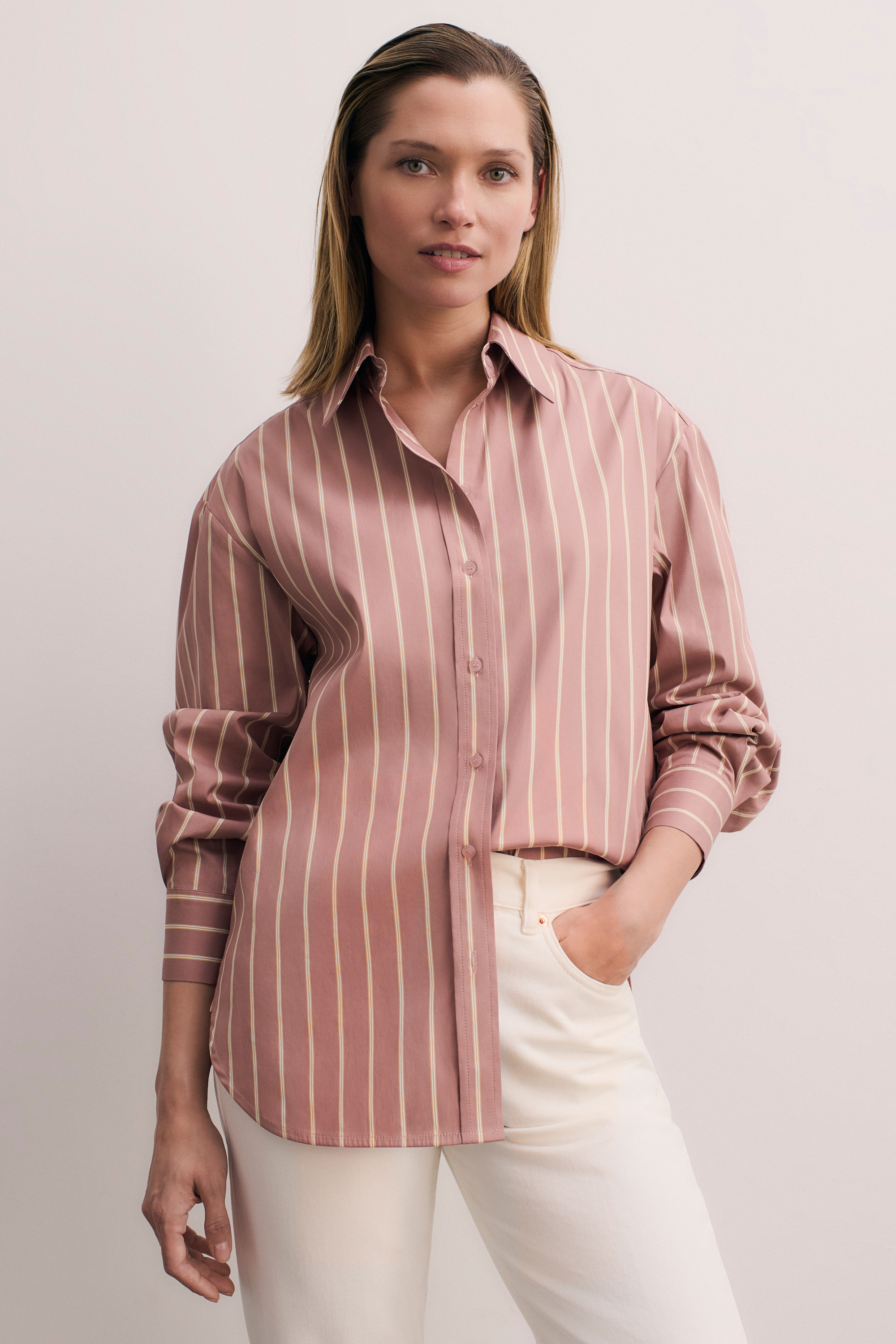 No wardrobe is complete without the perfect shirt – and the striped Claudia is just that. It’s cut to a relaxed fit with dropped shoulders, while a point collar and button placket keep things sleek. Wear with everything from tailoring to off-duty denim.