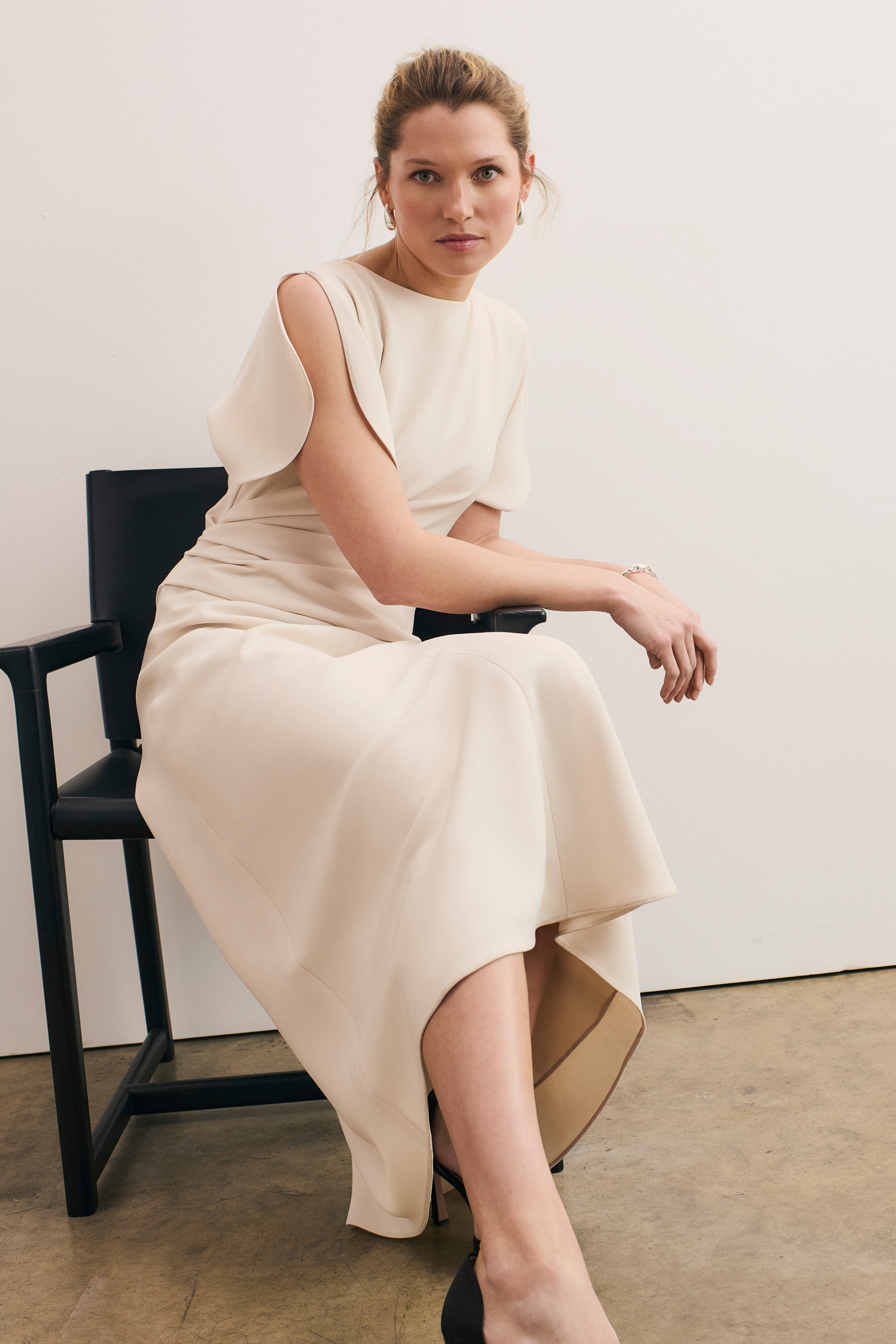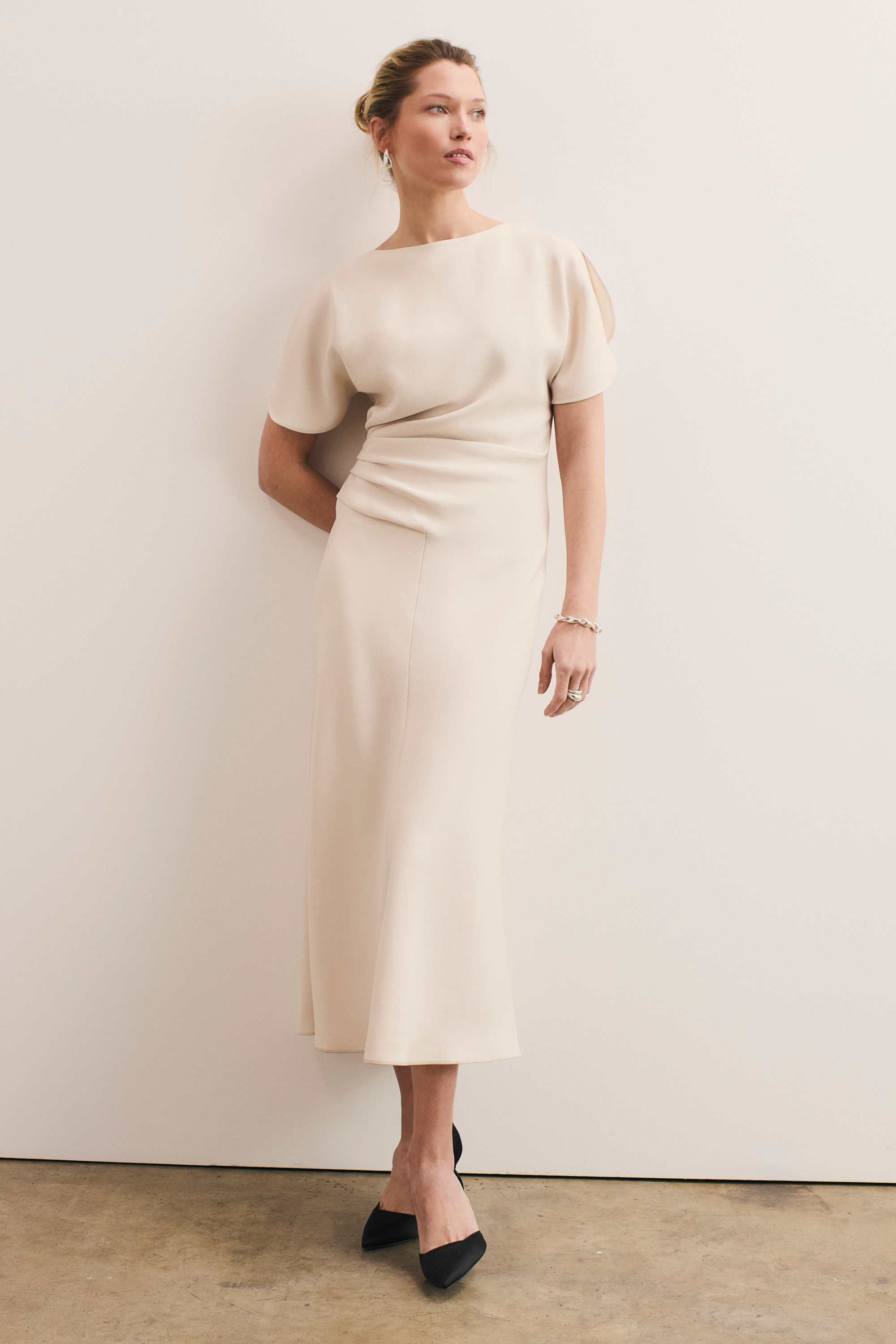 Crafted from flattering Clever Crepe Doppio, this iteration of our bestselling Salerno dress is subtly textured. It features our signature gathered waistband, a slash neck and curved sleeves that fall open like flower petals. Straight in its silhouette, it’s the ultimate in elegant event-ready style.
