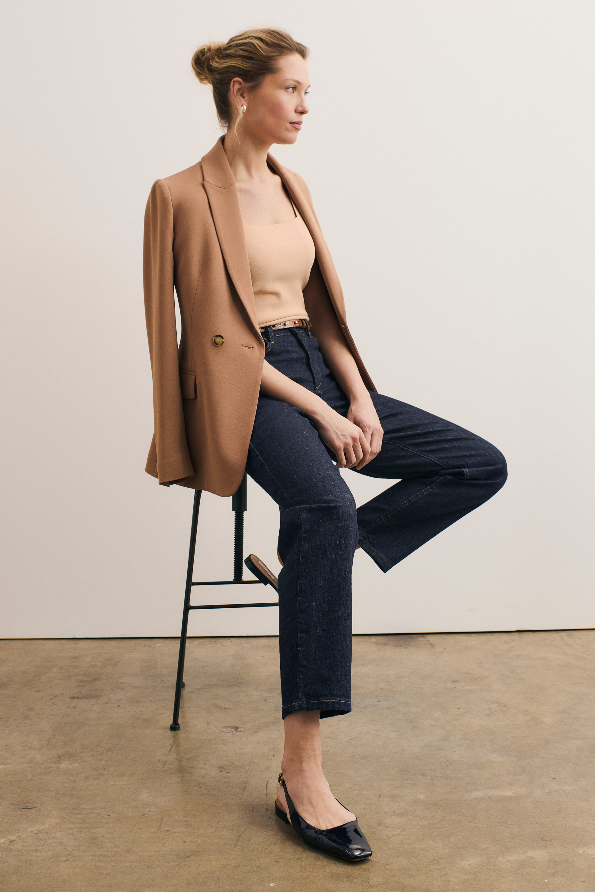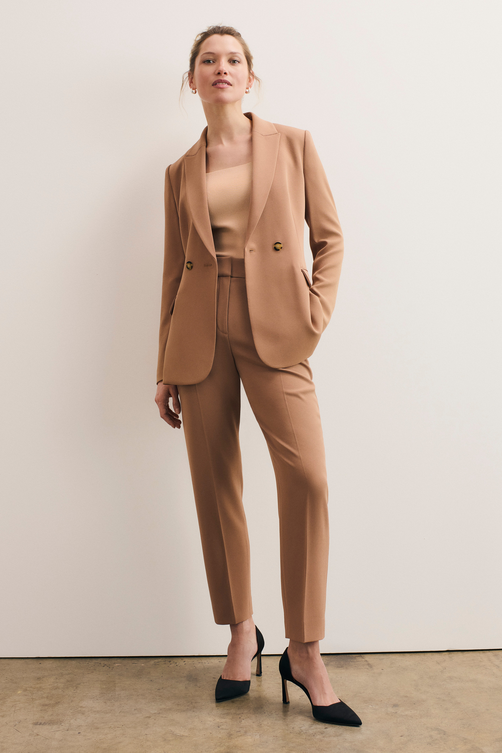 Double-breasted but not boxy, our signature Knighton jacket drapes beautifully on all body types. It's cut to a longline, semi-fitted silhouette with neat shoulders and subtle seam detailing for shaping throughout the body. Style yours with the coordinating Clever Crepe trousers.