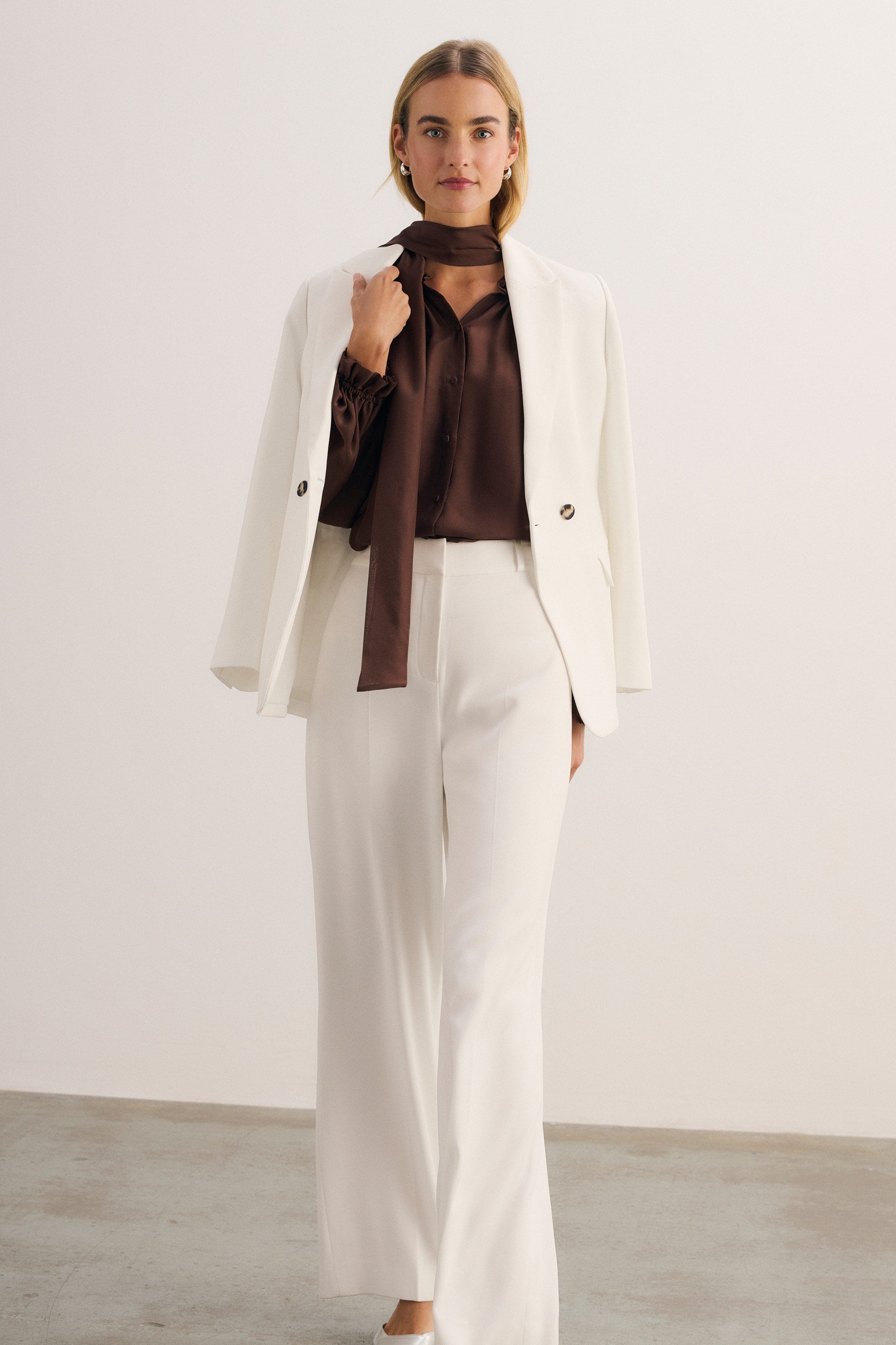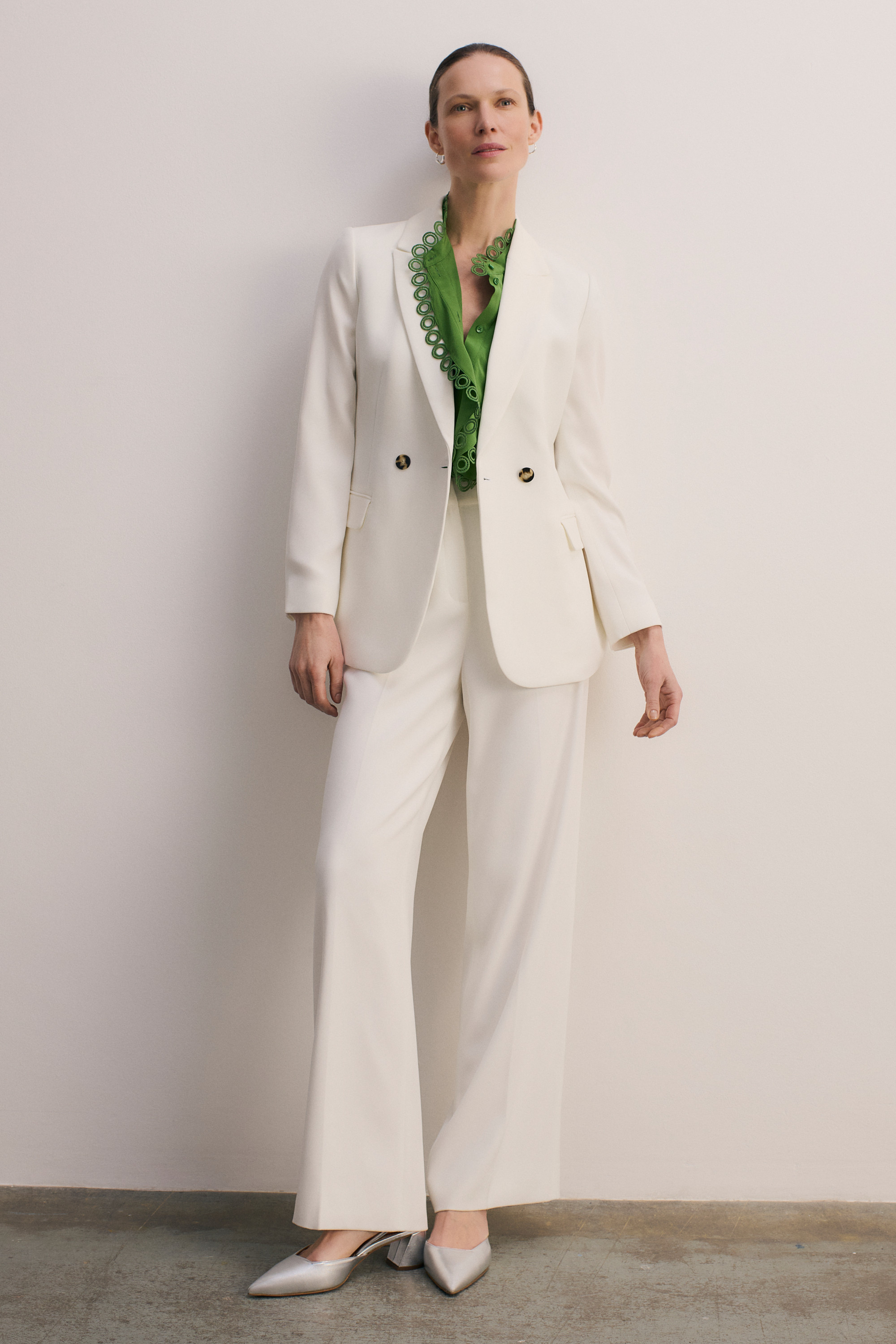 Double-breasted but not boxy, our signature Knighton jacket drapes beautifully on all body types. It's cut to a longline, semi-fitted silhouette with neat shoulders and subtle seam detailing for shaping throughout the body. Style yours with the coordinating Clever Crepe trousers.