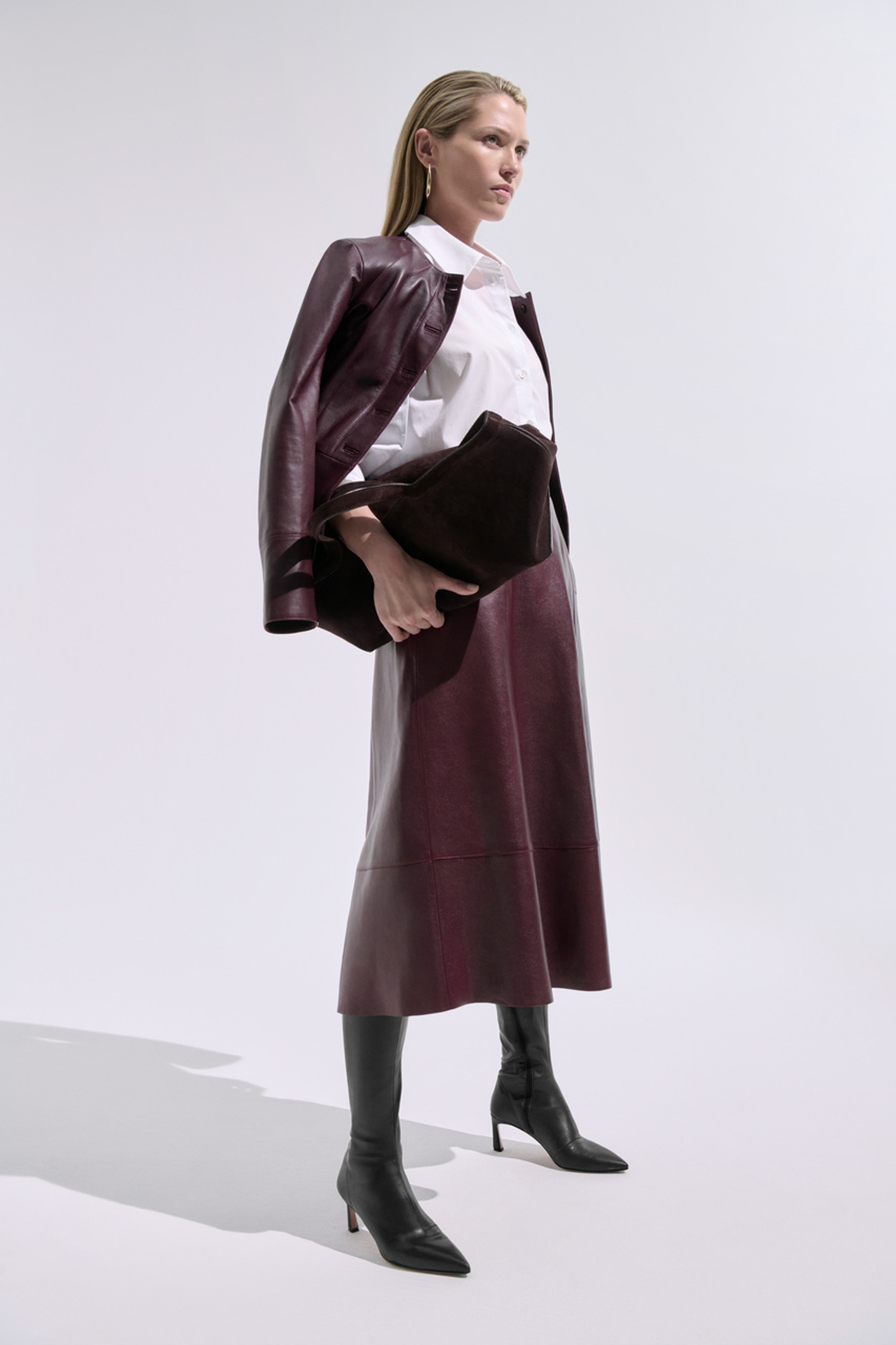 Crafted from 100% responsibly sourced leather that's been vegetable tanned, our luxurious Ginevra is a wardrobe essential, our way. It’s cut with a contemporary crew neckline and topstitching darts for detailing, while a subtle peplum waist speaks to our signature style.