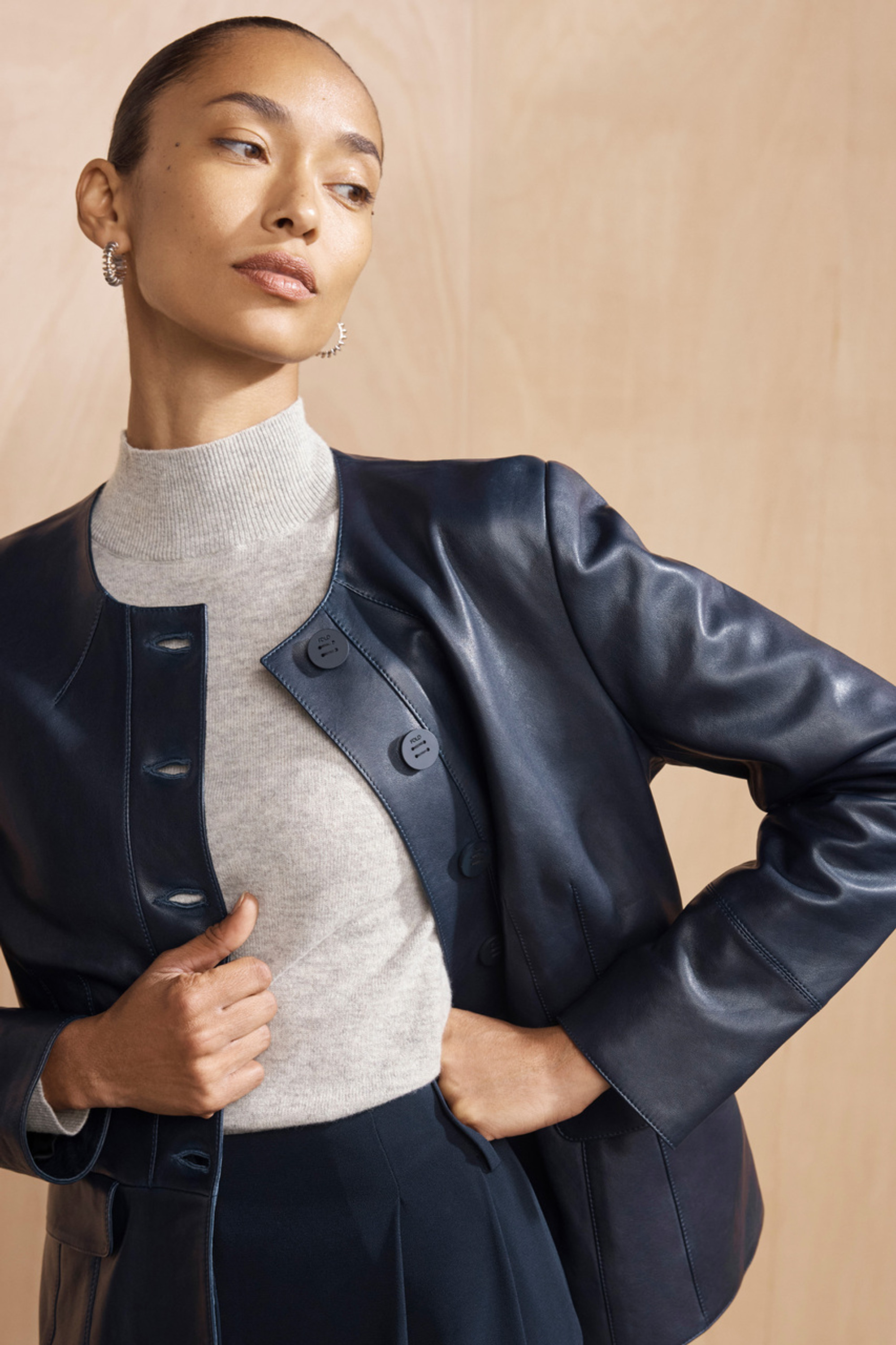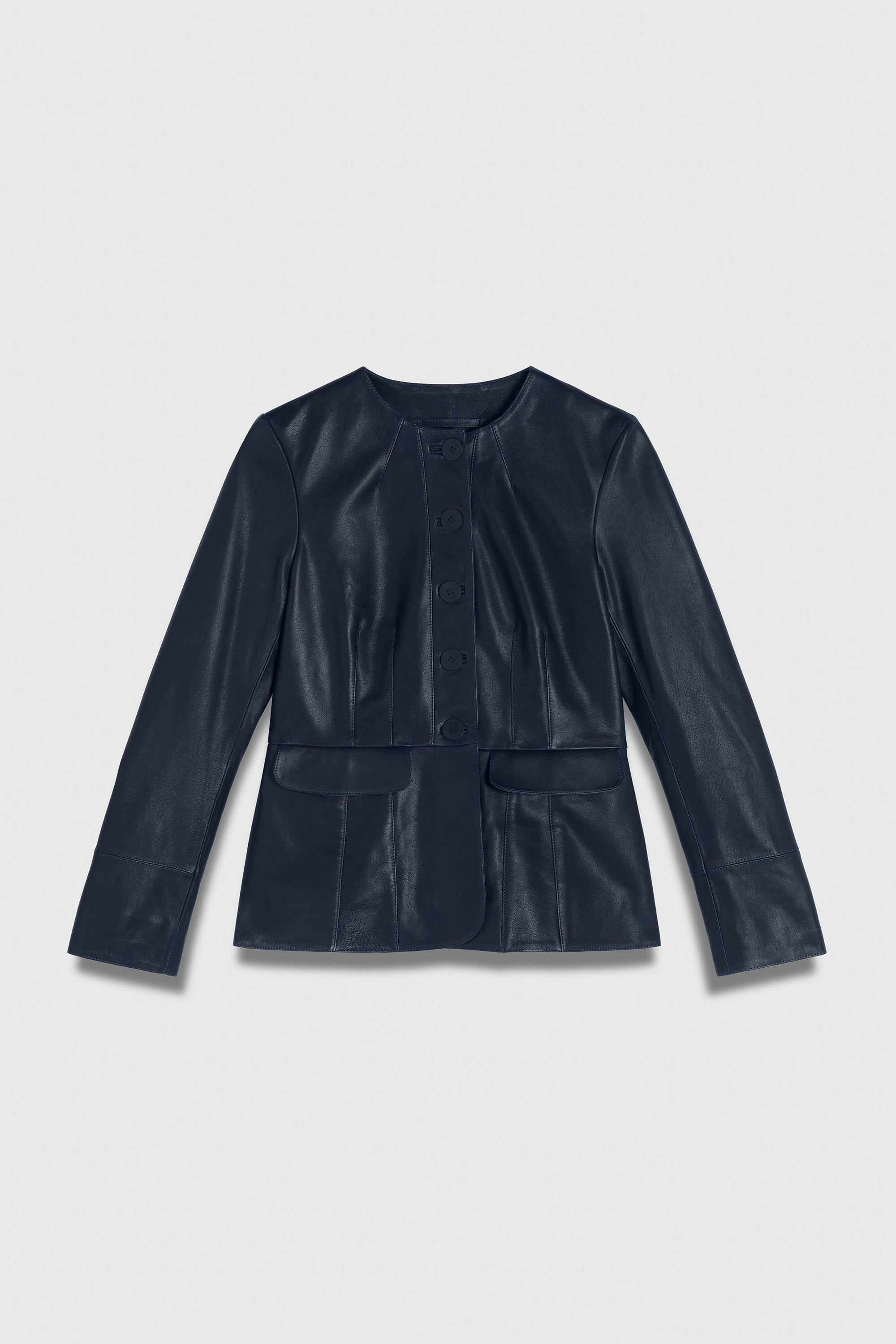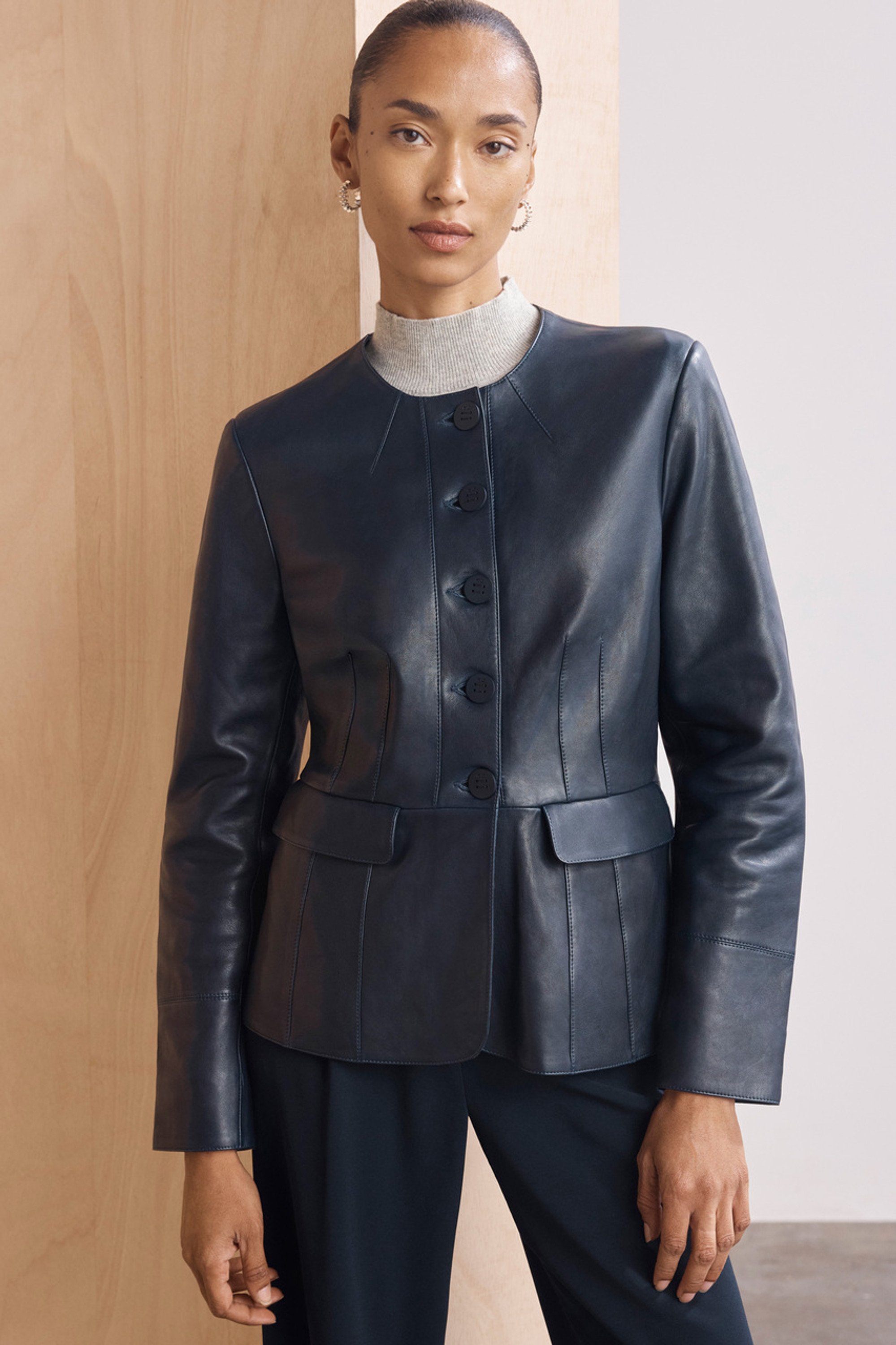 Crafted from 100% responsibly sourced leather that's been vegetable tanned, our luxurious Ginevra is a wardrobe essential, our way. It’s cut with a contemporary crew neckline and topstitching darts for detailing, while a subtle peplum waist speaks to our signature style.