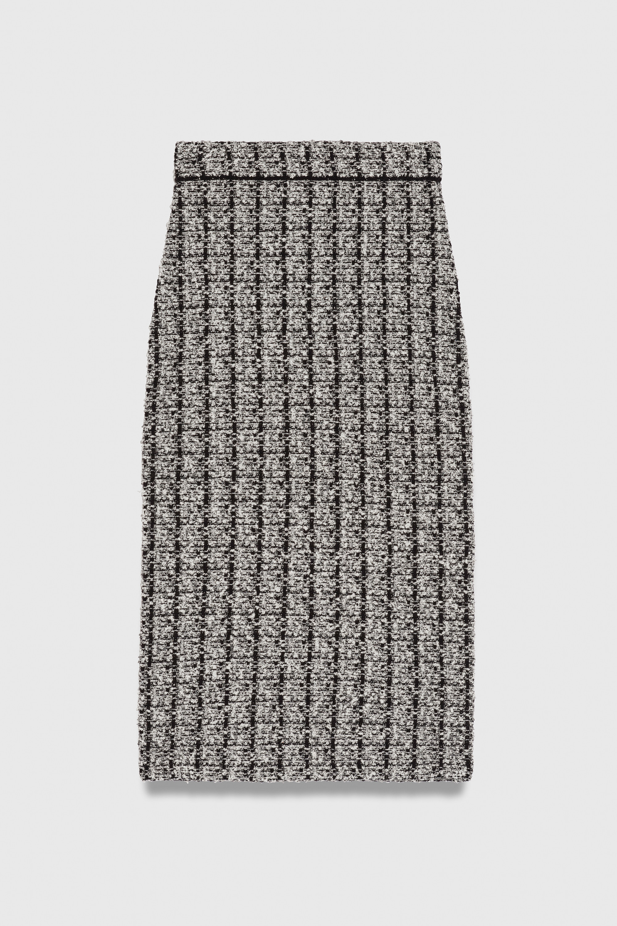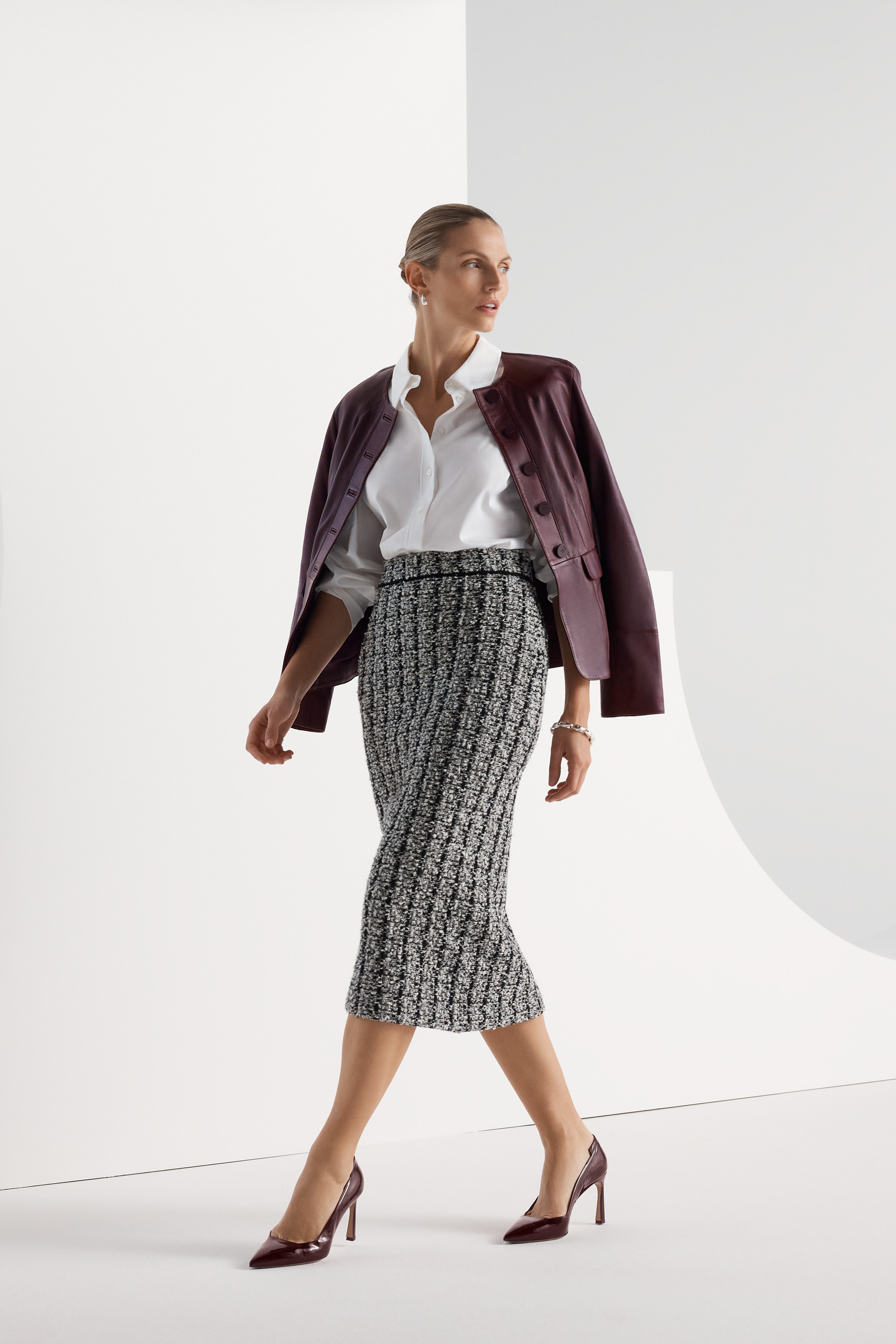 The Hampton skirt is knit from a unique mix of selected yarns (including subtle metallic fibres) to create an authentic and supremely soft tweed look. Knit to a modern pencil skirt silhouette with an elasticated waistband, it pairs with neutral separates and the coordinating jacket.