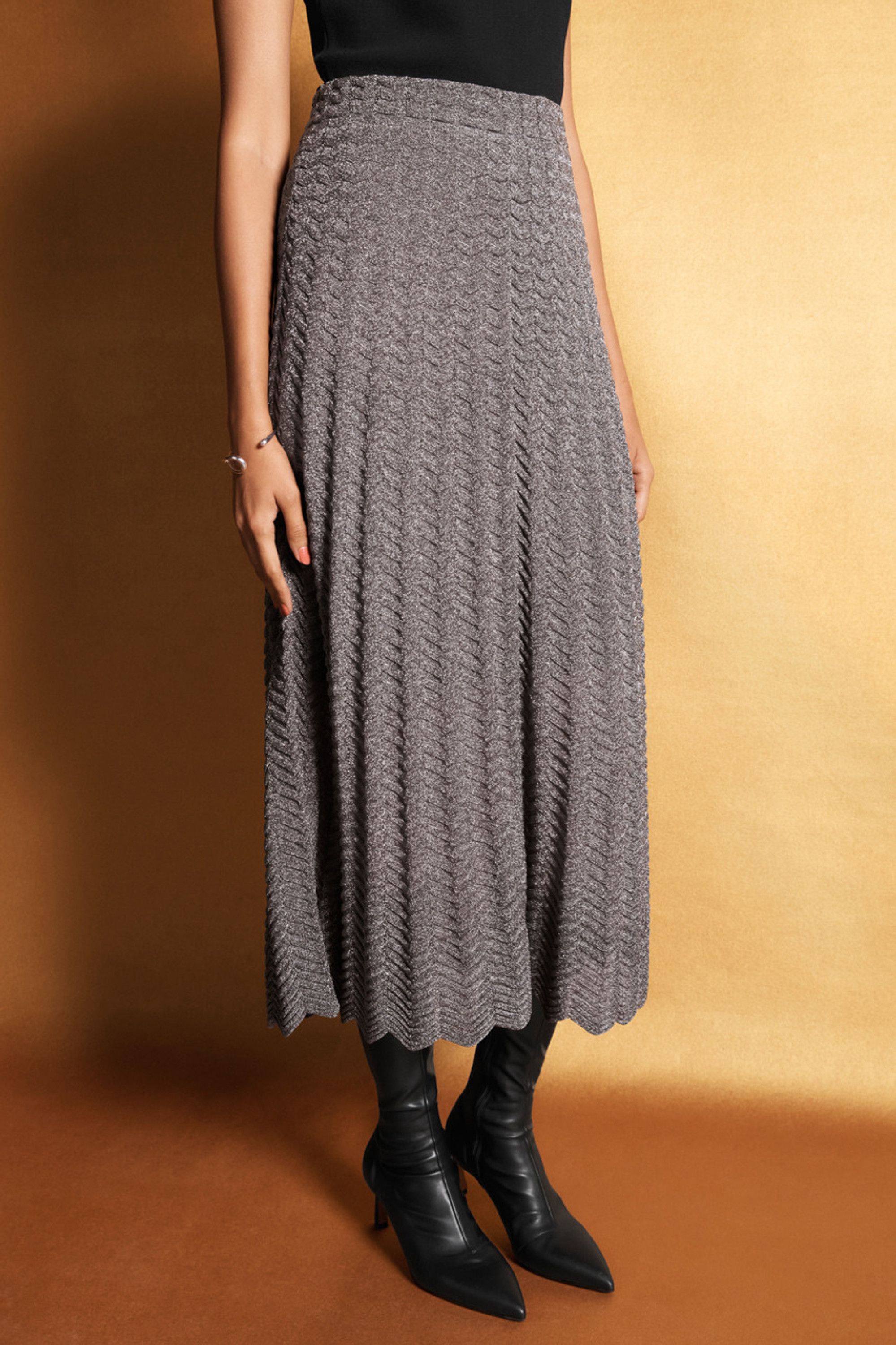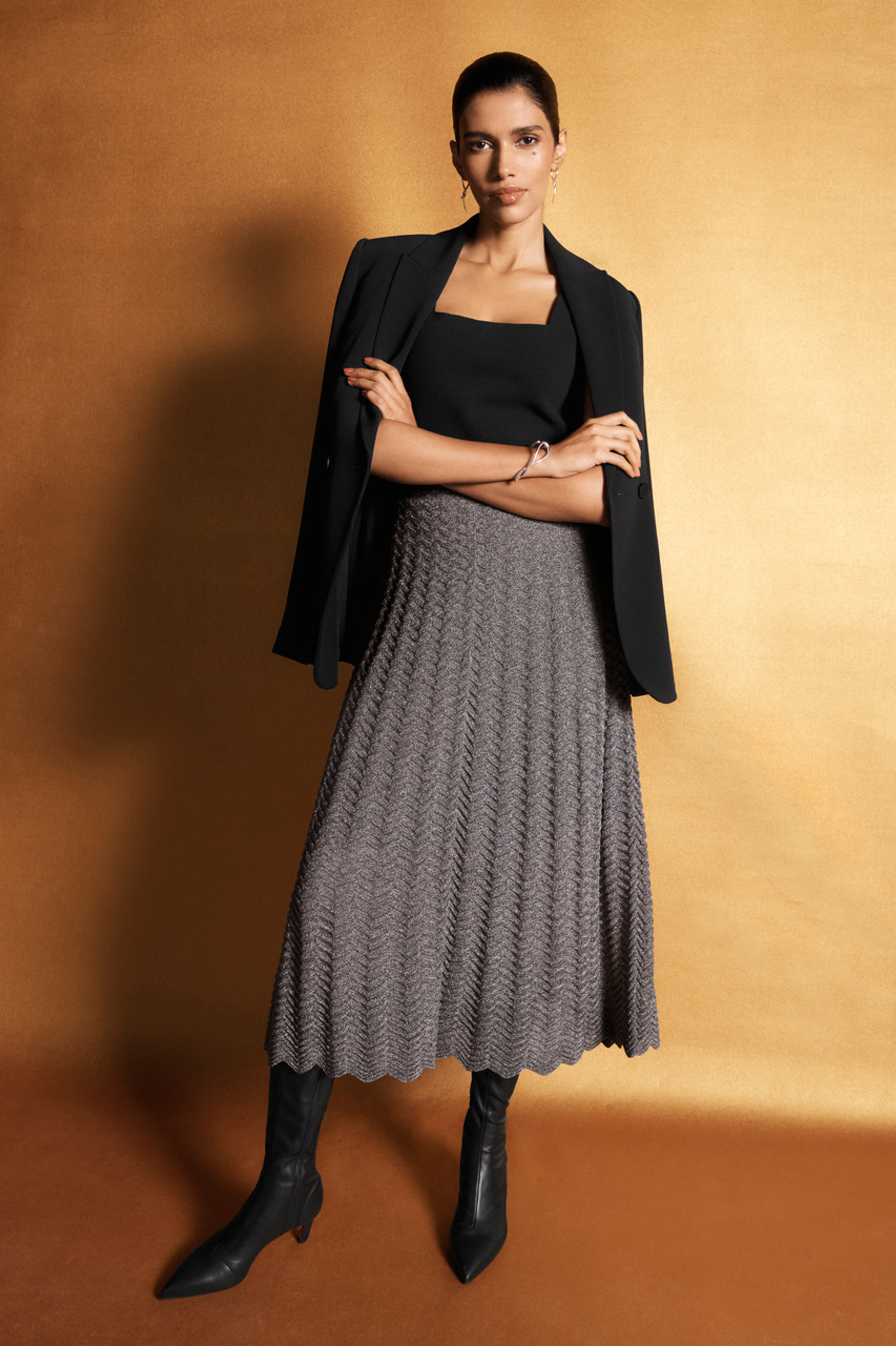 A returning bestseller, the metallic Irvine skirt can be paired with the coordinating Ashford top or your favourite neutral separates. Its chevron knit gradually gets wider towards the bottom of the skirt so that it flatters the figure, gracefully moving with you as you walk (or dance).