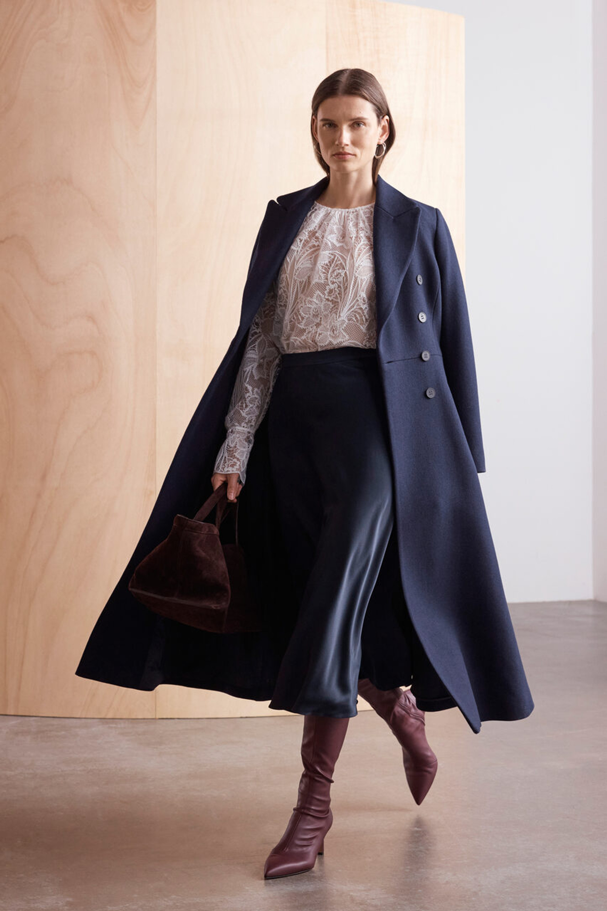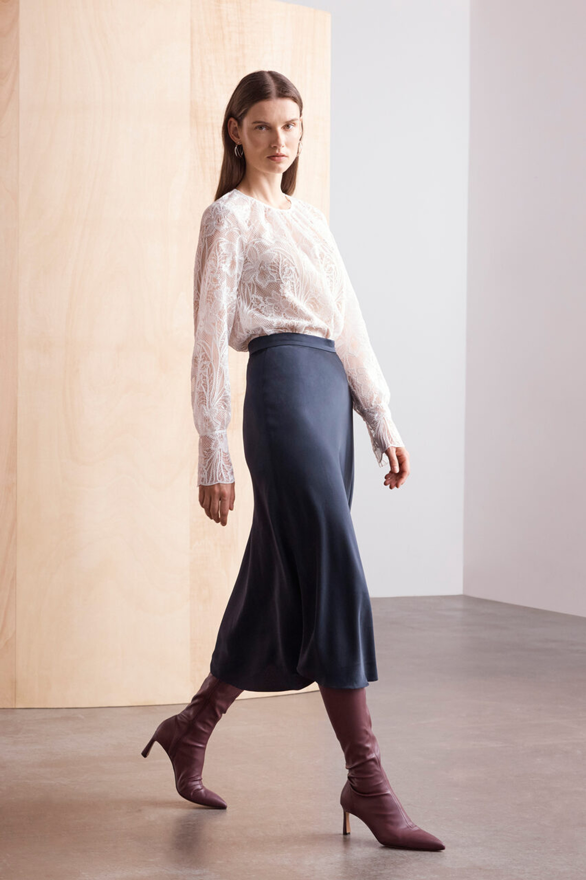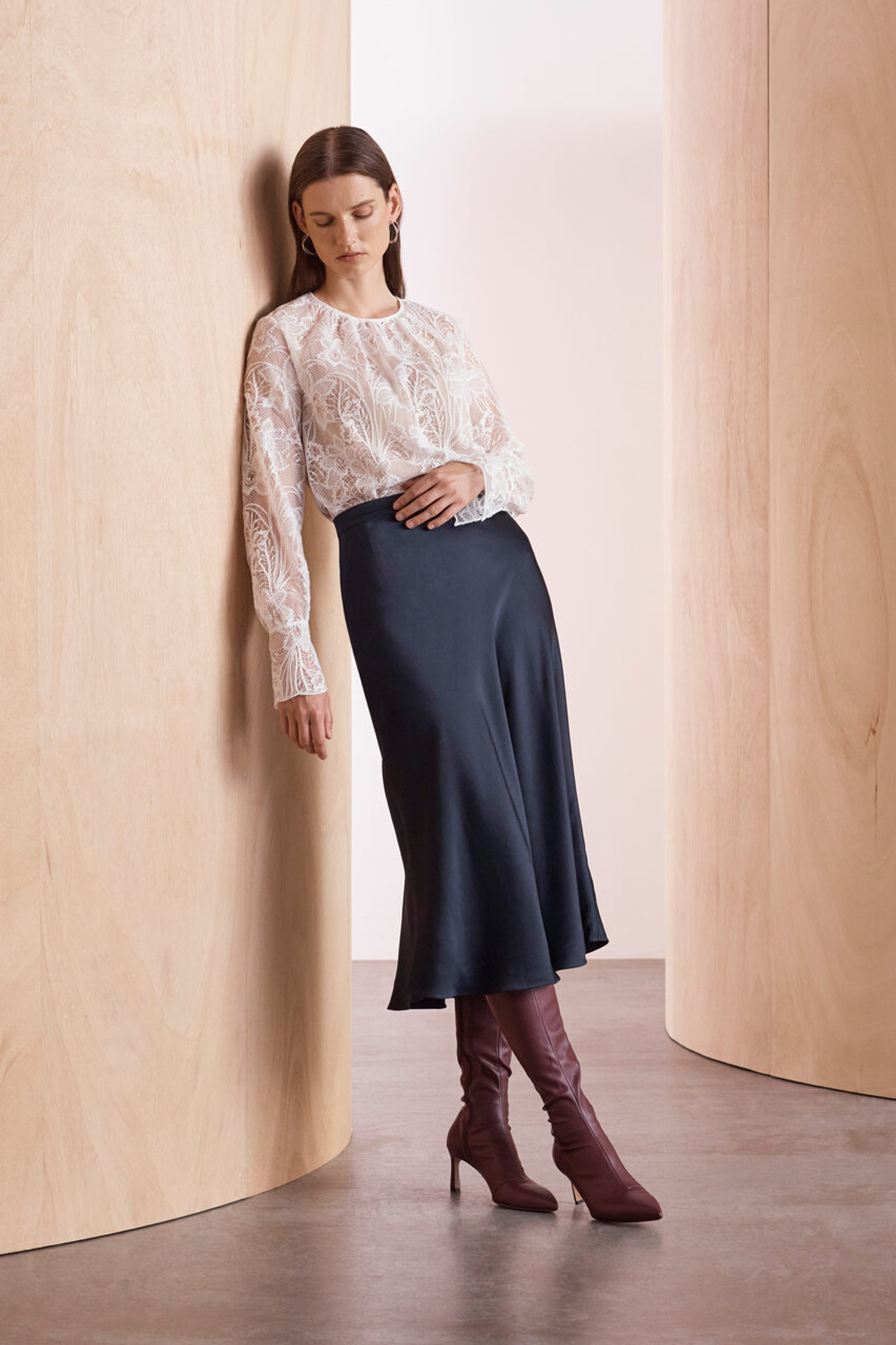 Cut on the bias from fluid satin, the Kelmore skirt drapes beautifully on every body. Falling from a high waist into a flattering midi length, it looks just as good with the coordinating Skye top as it does the Vaila blouse.