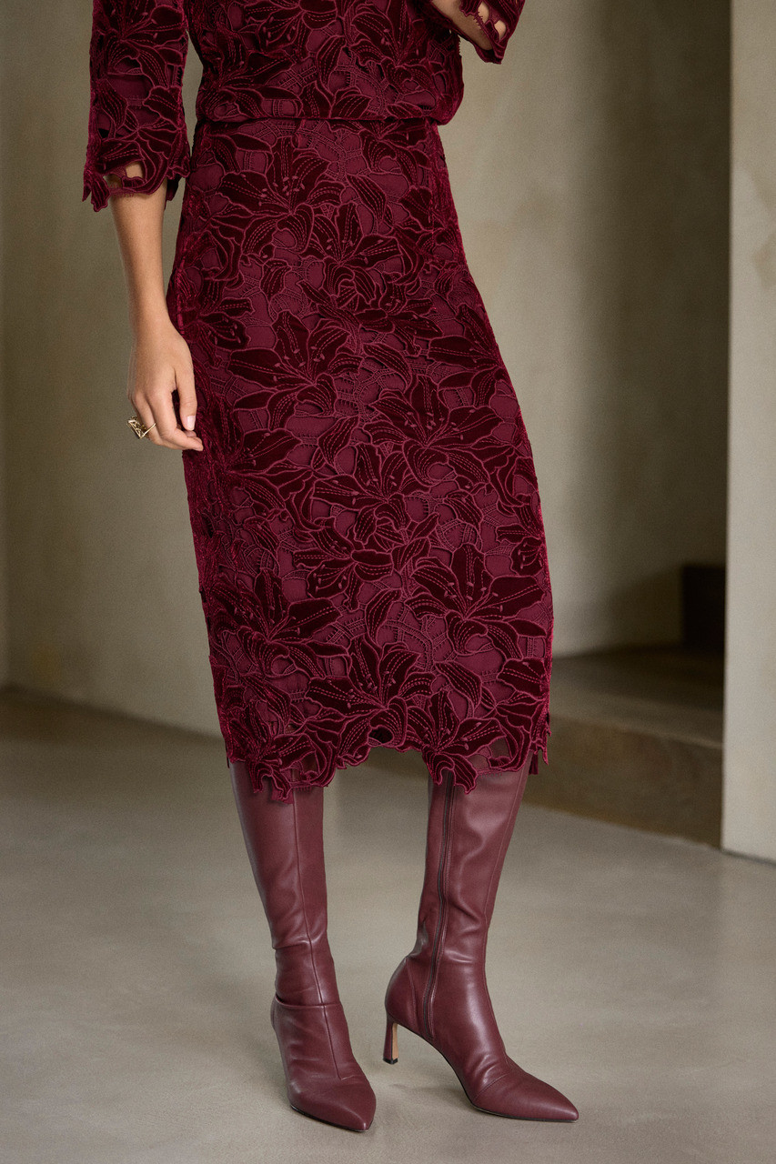 Looking for the perfect party separate? This iteration of our bestselling Kerrison skirt is just that. Cut to a flattering pencil silhouette, it’s crafted from velvet lace that’s embroidered with beautiful floral cutouts. Wear yours head-to-toe with the coordinating Ameria top.