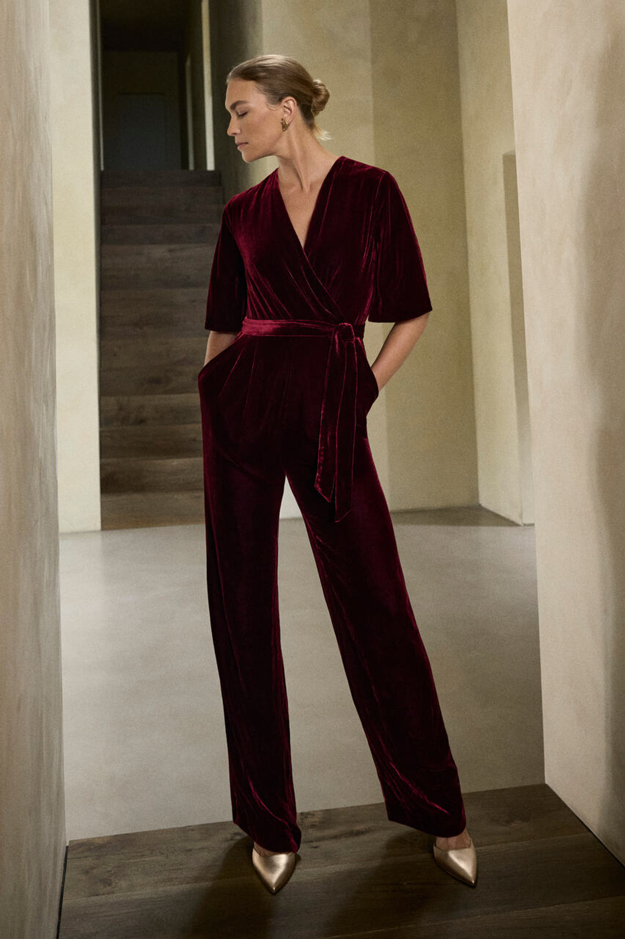 Where statement event style meets night-long comfort, the Langford jumpsuit is crafted from a blend of breathable fabrics and soft silk for a beautiful velvet sheen. Draped across the body for a fluid finish, the wide-leg style is finished with a high waistband and detachable belt.