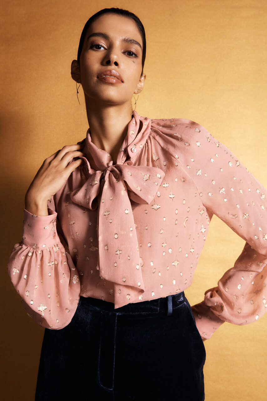 Detailed with metallic fil coupé stars, moons and circles, Lusia is a true statement blouse. It’s crafted from pure silk to a floaty silhouette with a tie that threads through a loop at the back of the neck – style yours in a bow, as a scarf, undone or remove it completely.