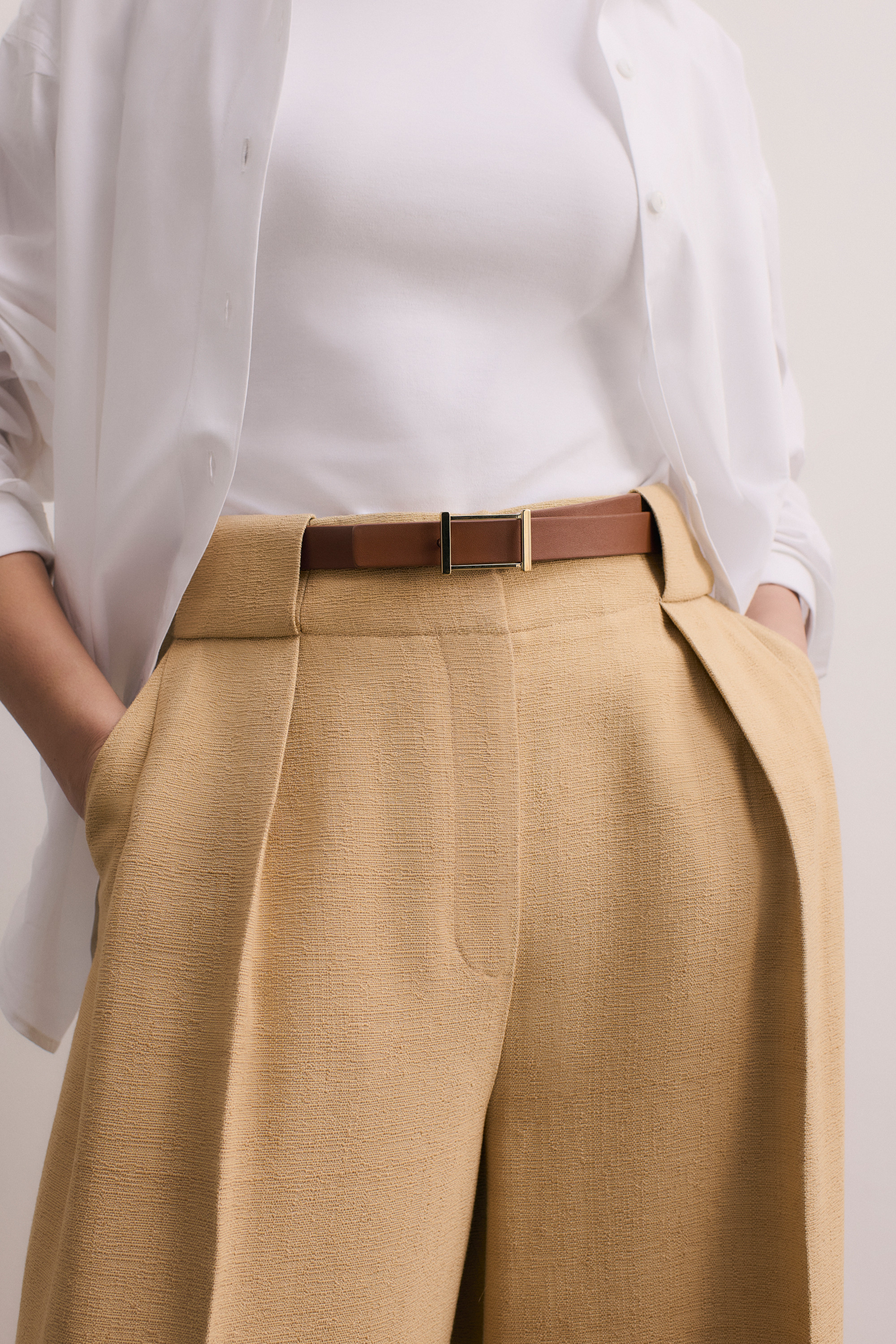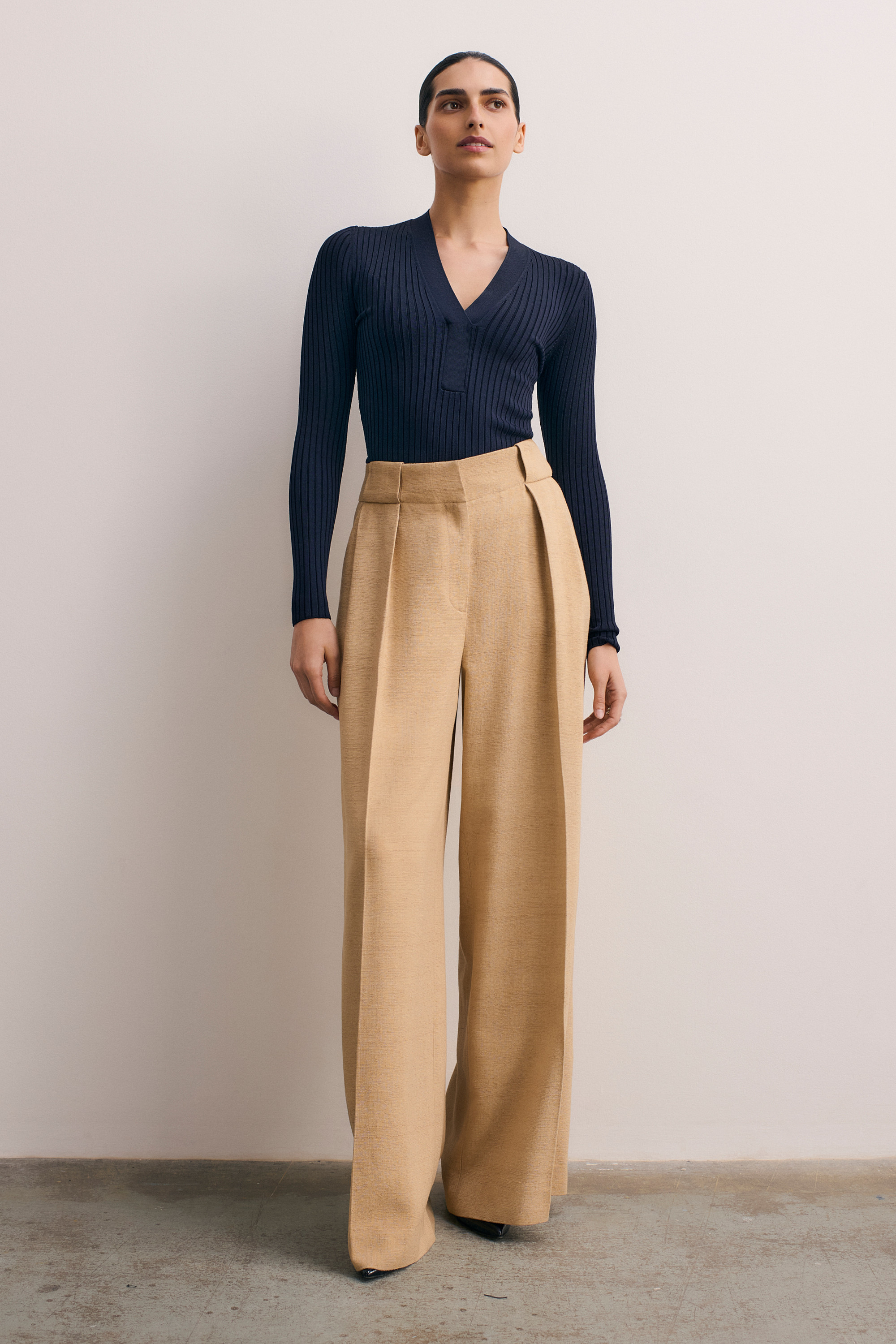 A relaxed take on traditional tailoring, the Lyon trousers are cut from a lightweight, textured fabric to a palazzo silhouette. Box pleats extend from the leg to the belt to create an elongated shape that pairs perfectly with blouses and tailoring.