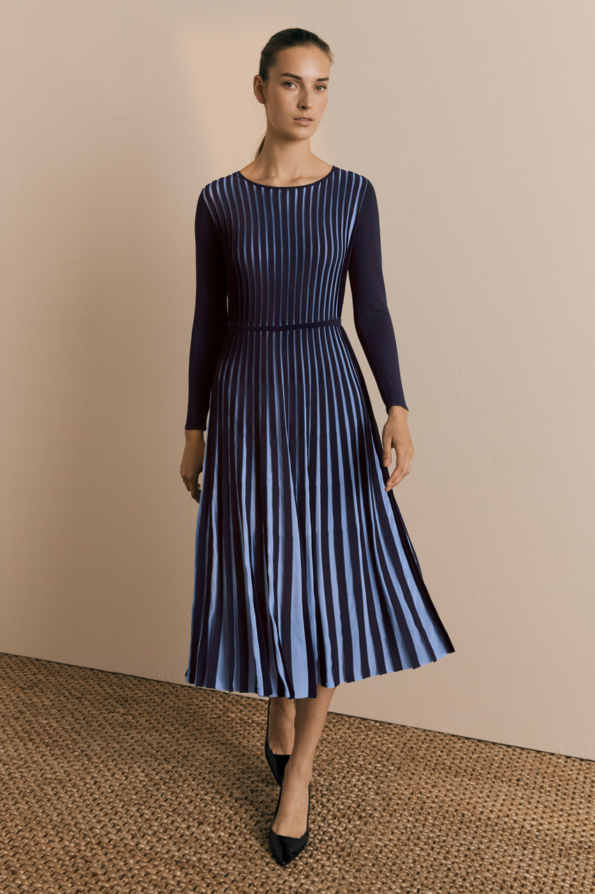The new season Mara dress is defined by our signature engineered pleating for an architectural finish. Navy and cornflower panels create a beautiful colourblock moment, exaggerating the lines of each pleat. Elsewhere, our meticulous attention to detail continues; note the jersey knit sleeves and waistband which are in solid navy, and its timeless fit-and-flare silhouette. This is the kind of dress you'll want to wear for seasons to come.
