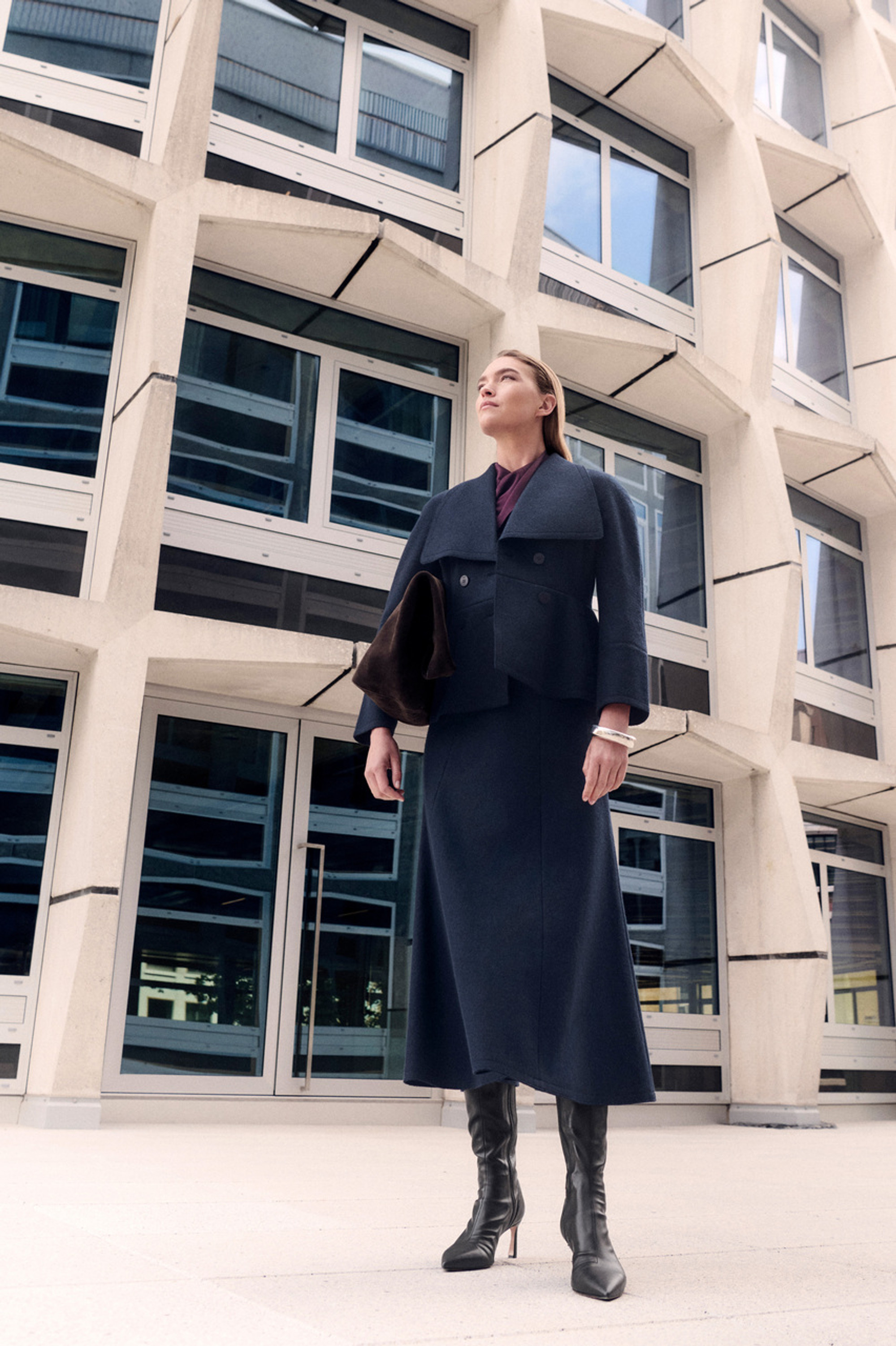 The Napier jacket is crafted from boiled wool – a fabrication renowned for its durability and warming, felted texture. Cut to a double-breasted silhouette with a wide, open collar, it looks as good with your favourite tailoring as it does the coordinating Ellingham skirt.