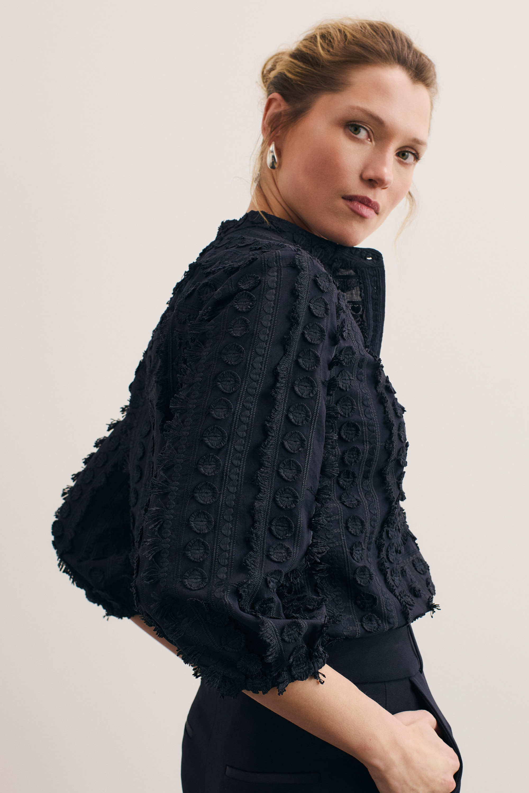 No wardrobe is complete without a top that can be dressed up or down, and the Nola is just that. Here, it’s all about the texture; look closely and you’ll spot 3D circles, hearts and fringing throughout its intricate embroidered design. Meanwhile, a stand collar and cropped sleeves keep things contemporary.