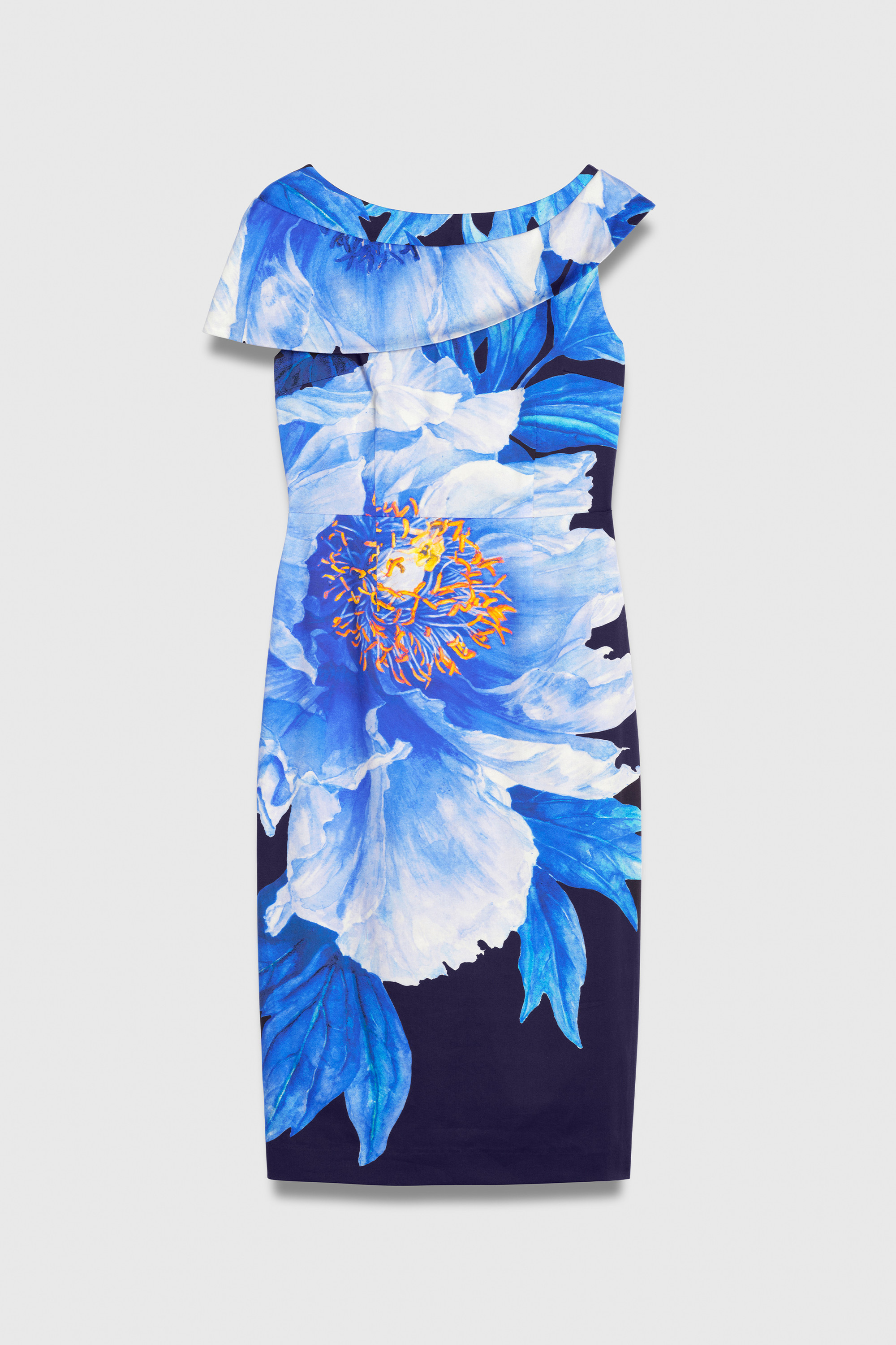 Our bestselling Palmerston dress has been reimagined with a beautiful peony watercolour placement print, taken from a painting by Rosie Sanders. It’s the first time we’ve detailed the iconic silhouette with a pattern; blending the sleek dress with the romance of the enlarged watercolour painting for a style that’s truly unique. Crafted from Italian stretch cotton that’s both comfortable and flattering, it maintains the exceptional fit that we’re known for, with the asymmetric shoulder drape, contouring seam detailing and unique peplum waist that make this dress one of our bestselling styles.