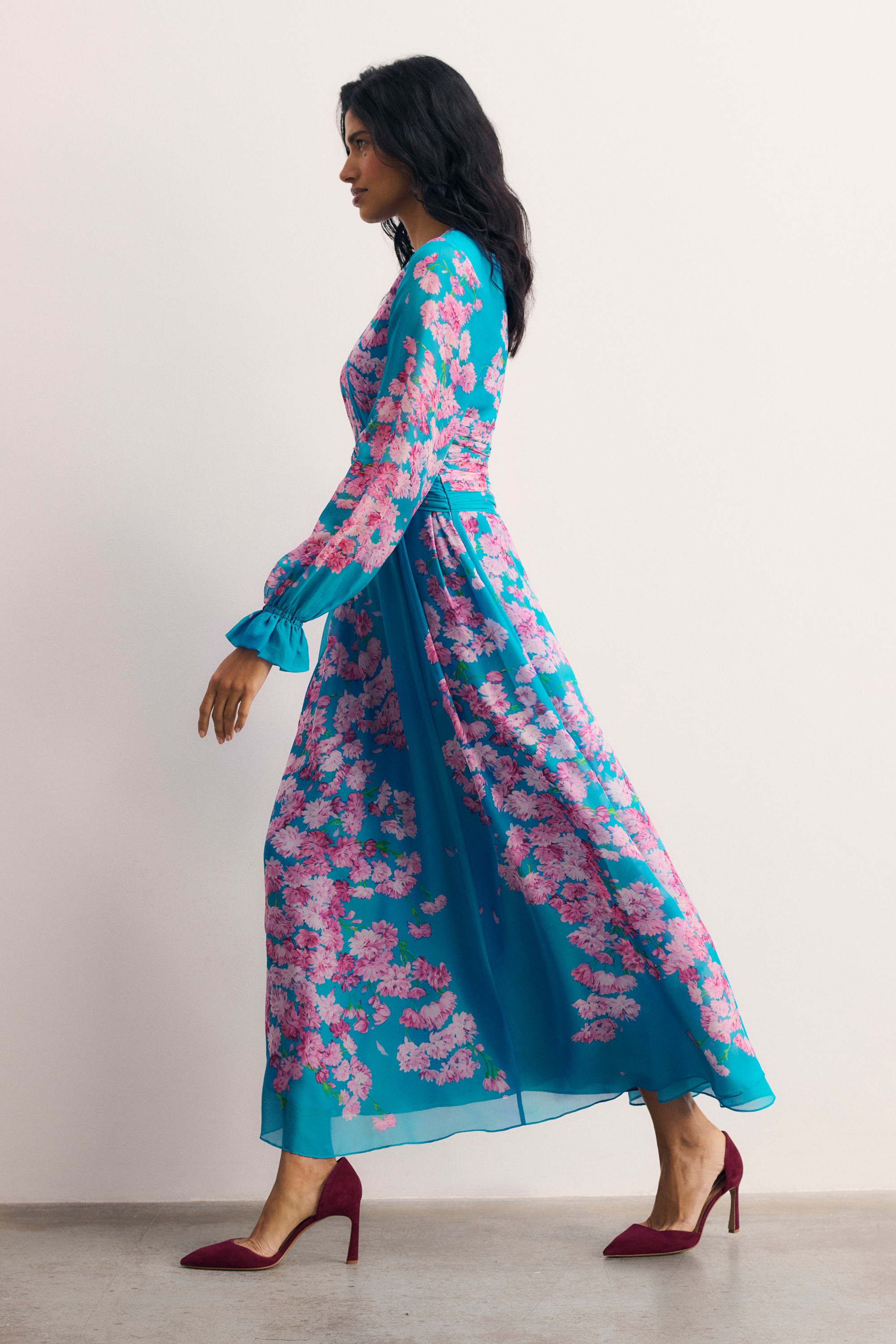 This season, our standout Portofino dress is detailed with a beautiful cherry blossom print, painted and printed in an Italian studio before being skilfully positioned for the most beautiful finish. It’s crafted from delicate fluid silk chiffon with subtle volume in the sleeves, a flattering hand-draped waist detail and voluminous panelled skirt.