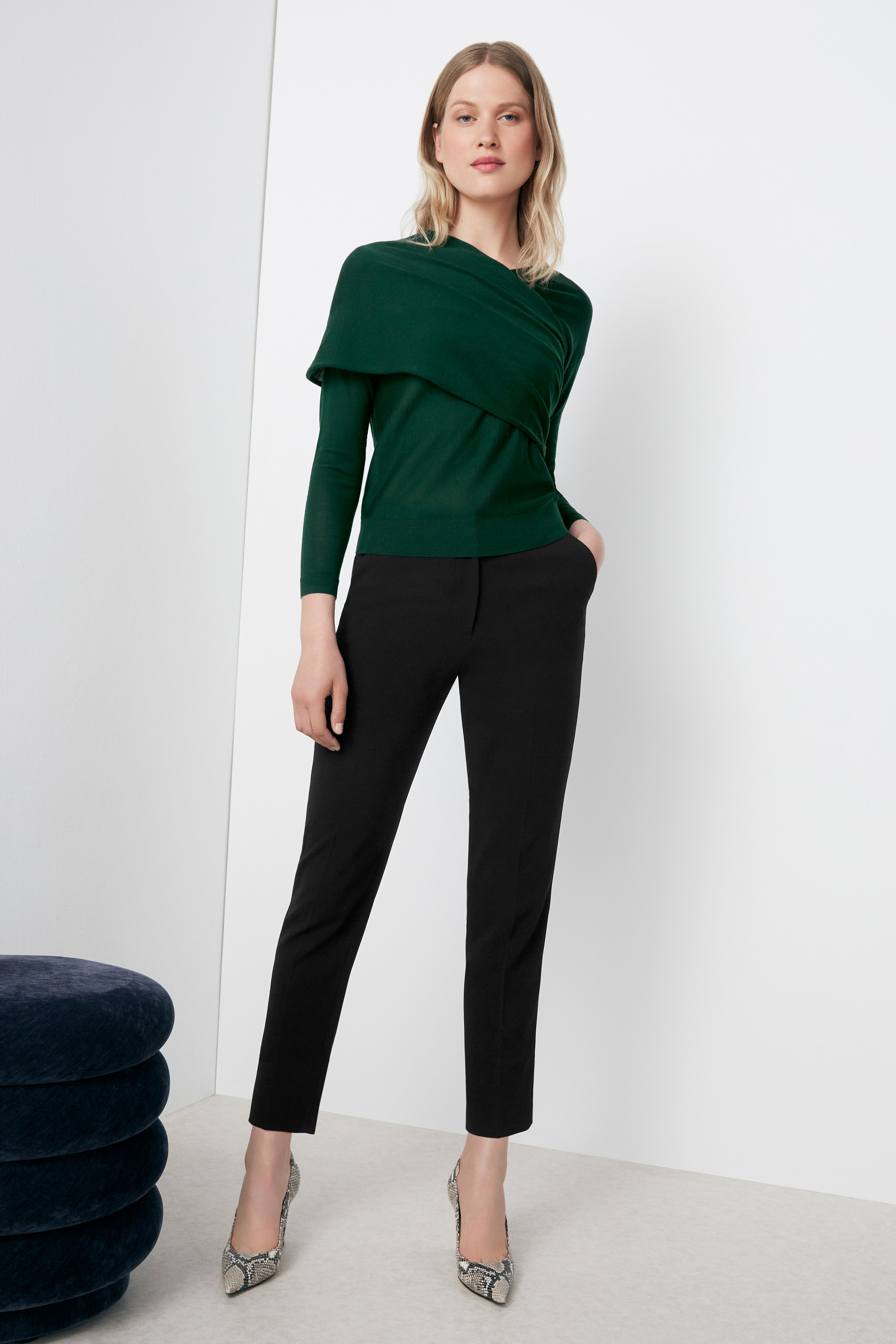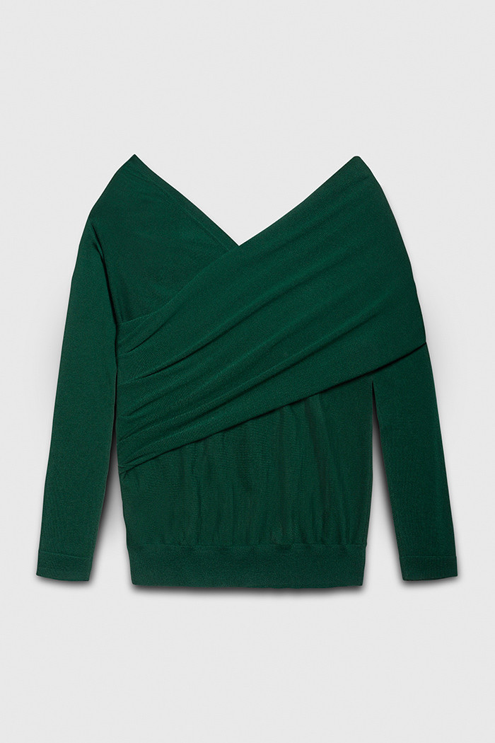 Knitted from superfine merino wool, the Riva sweater is relaxed yet elegant. Sumptuously soft, it feels as cosy as loungewear but is refined enough for the office. The wide V-neckline wraps asymmetrically across the shoulder and attaches under the arm, allowing you to ruche, widen or lower to suit your style. Subtle pleats draw into the side seam for a flattering fit. Designed in forest green, it'll bring cosiness and colour to your go-to black Clever Crepe trousers.