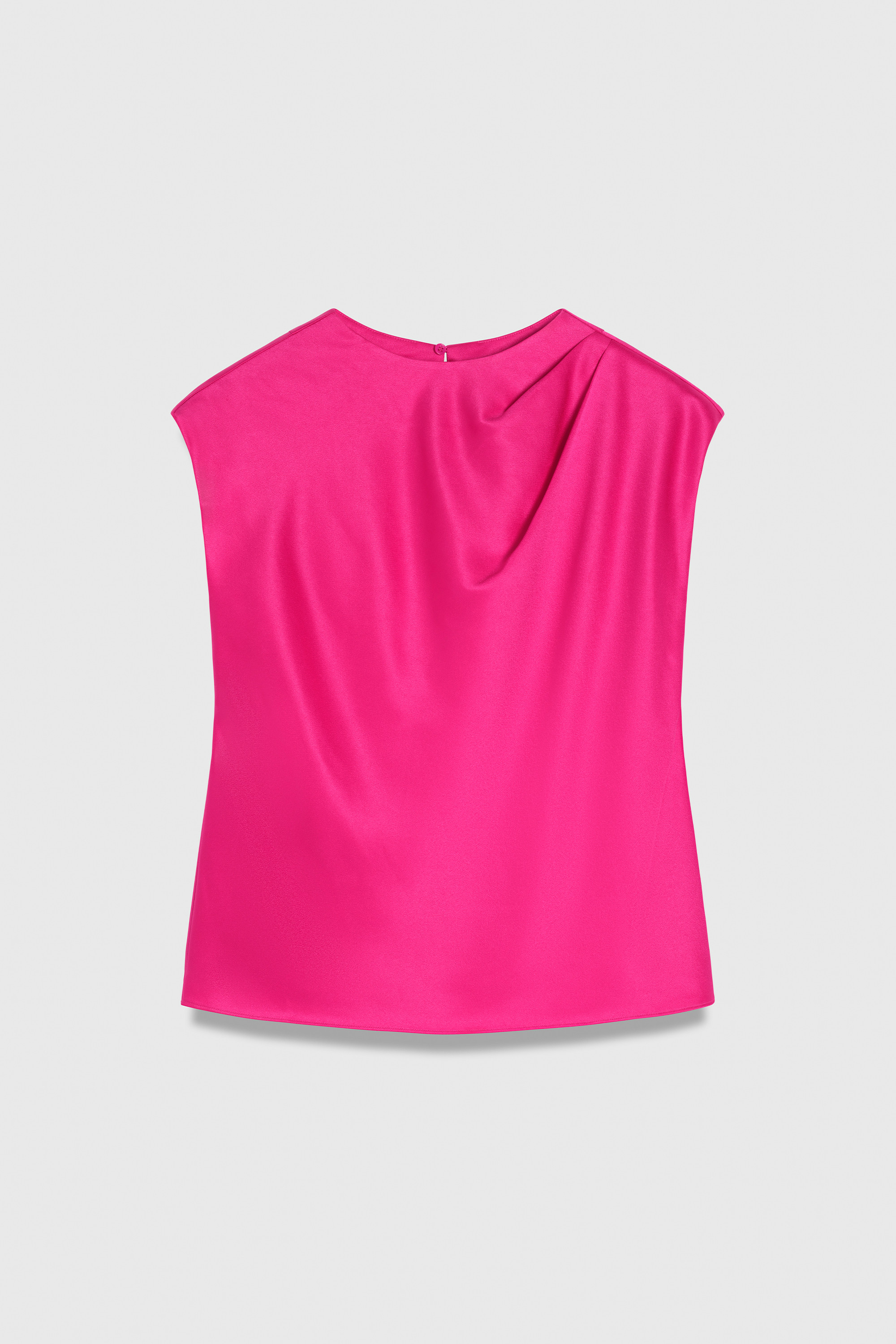 A Fold favourite, the Skye top is cut from vivid fuchsia pink Italian satin with a beautiful lustrous sheen. Skilfully draped in-house in our London atelier, the elegant sleeveless silhouette has a cowl neckline and beautiful gathering into the neckline that falls asymmetrically across the bodice. Pair yours with the Kelmore skirt for a coordinating look, or the patterned Arezzo trousers for the ultimate event-ready statement. To ensure the longevity of this piece, please be careful when pairing it with accessories that might rub against its delicate satin.
