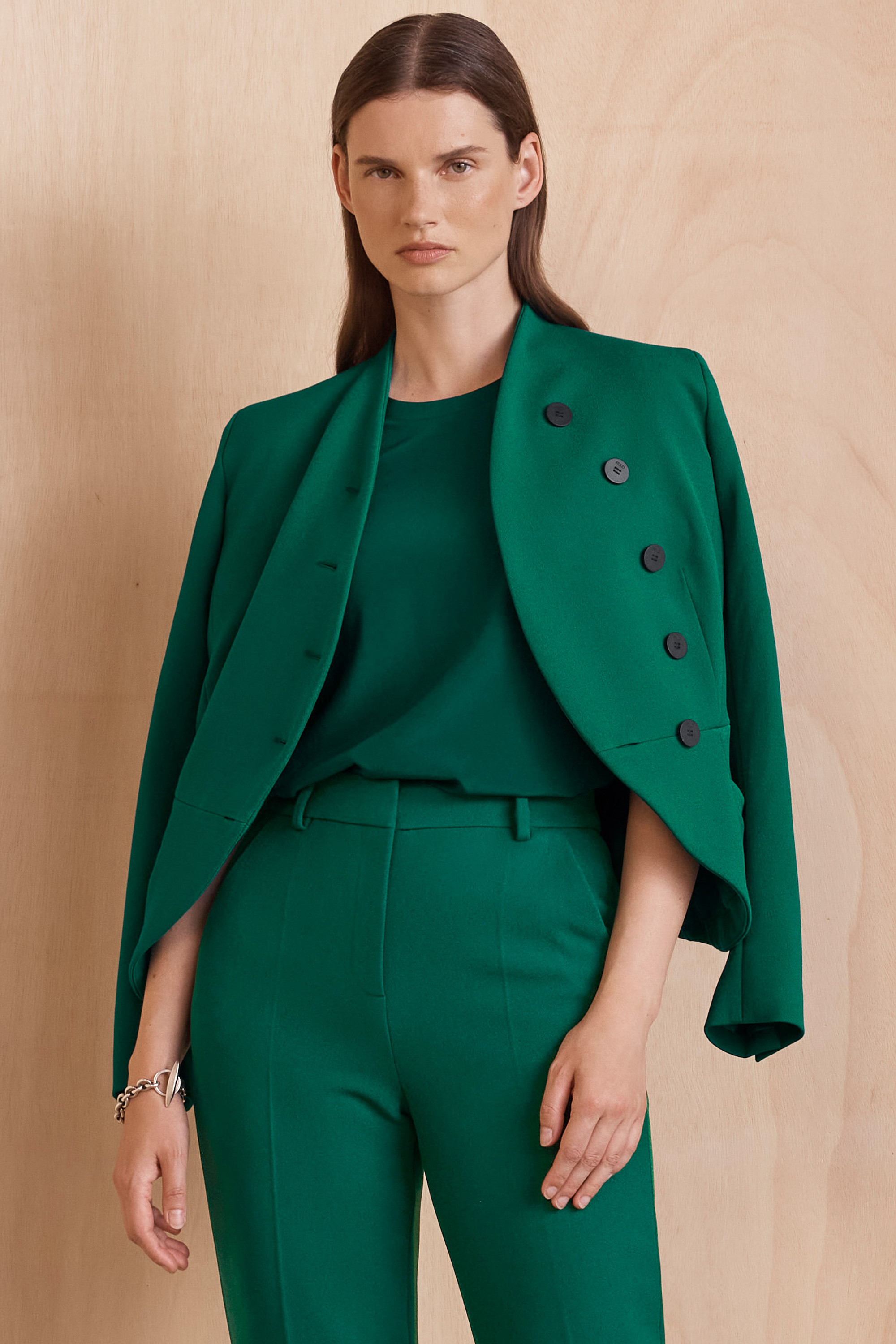 With curved wrap edges and a feminine asymmetric fastening, the sculpt stretch crepe Verona jacket is truly unique. It hugs the body with sculpting seams before cutting away to a soft curved hem, while angled pockets mimic the structured silhouette. In a shade of green created specifically for us, it looks best styled with the coordinating Adelaide or Tavira trousers.